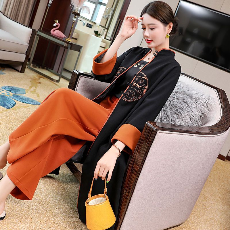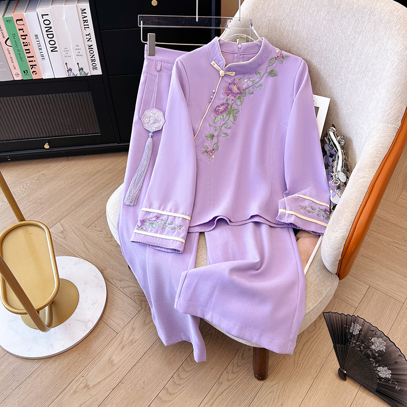 エスニック風改良チャイナスーツ春秋ドロップワイドレッグパンツママレトロスリムストレート刺繍2点セット