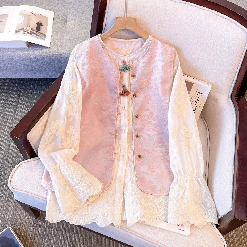 女性のベルスリーブシャツと新しい中国風のベストの重ね着2025春と秋の新しいスタイルのアメリカンスタイルの小さなシャツとベストのトレンド