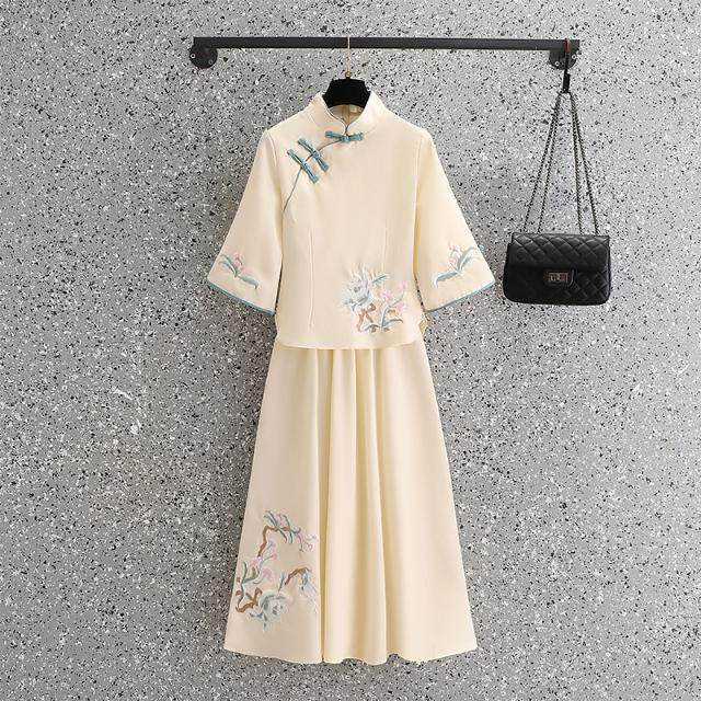 中国風高級茶服 日常改良七分袖刺繍玉蘭二点セット エレガントな新中式旗袍