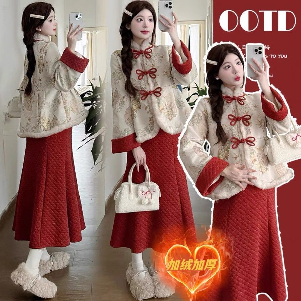 秋冬新款小个子连衣裙加绒加厚红色外套过年战袍新中式国风两件套