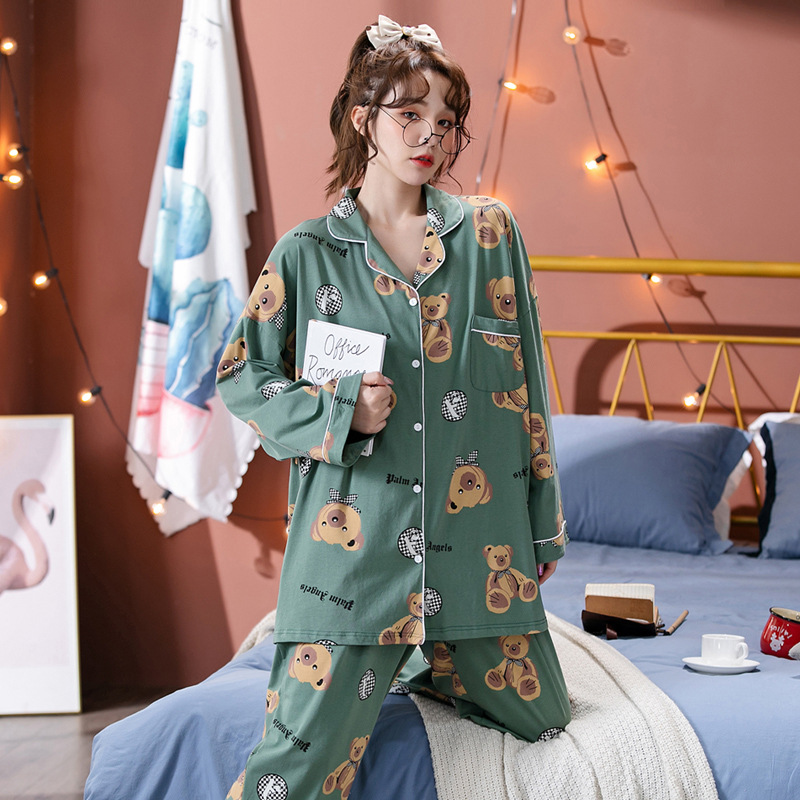 春と秋の大きいサイズのパジャマ薄い長袖ズボン女性の漫画かわいいホーム服韓国スタイルラペルプリントスーツ
