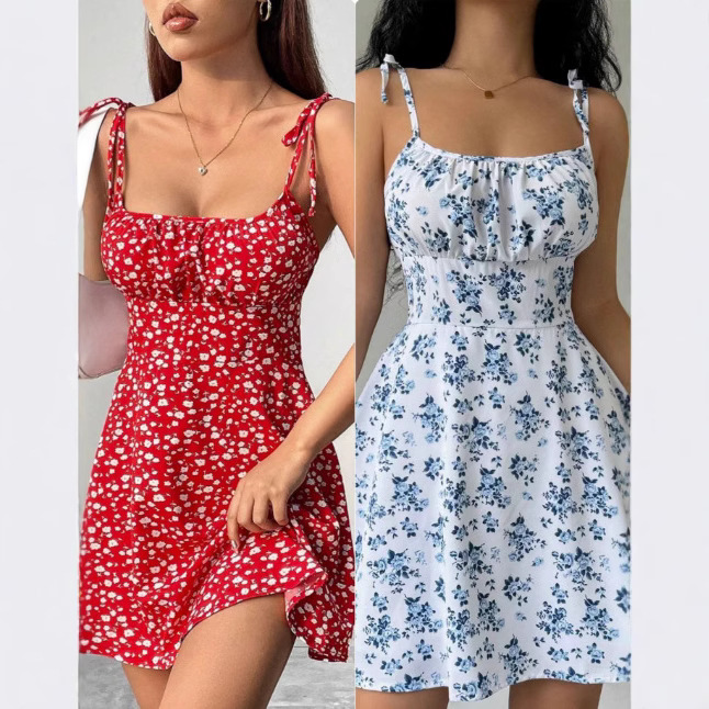 2026年夏新作、欧米風クロスボーダー人気商品、花柄キャミソールショートワンピース、スクエアネック、優しい雰囲気のショートスカート