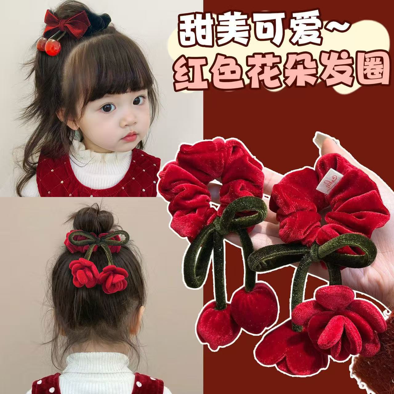 儿童新年丝绒郁金香大肠发圈女童可爱蝴蝶结飘带头绳扎马尾发饰