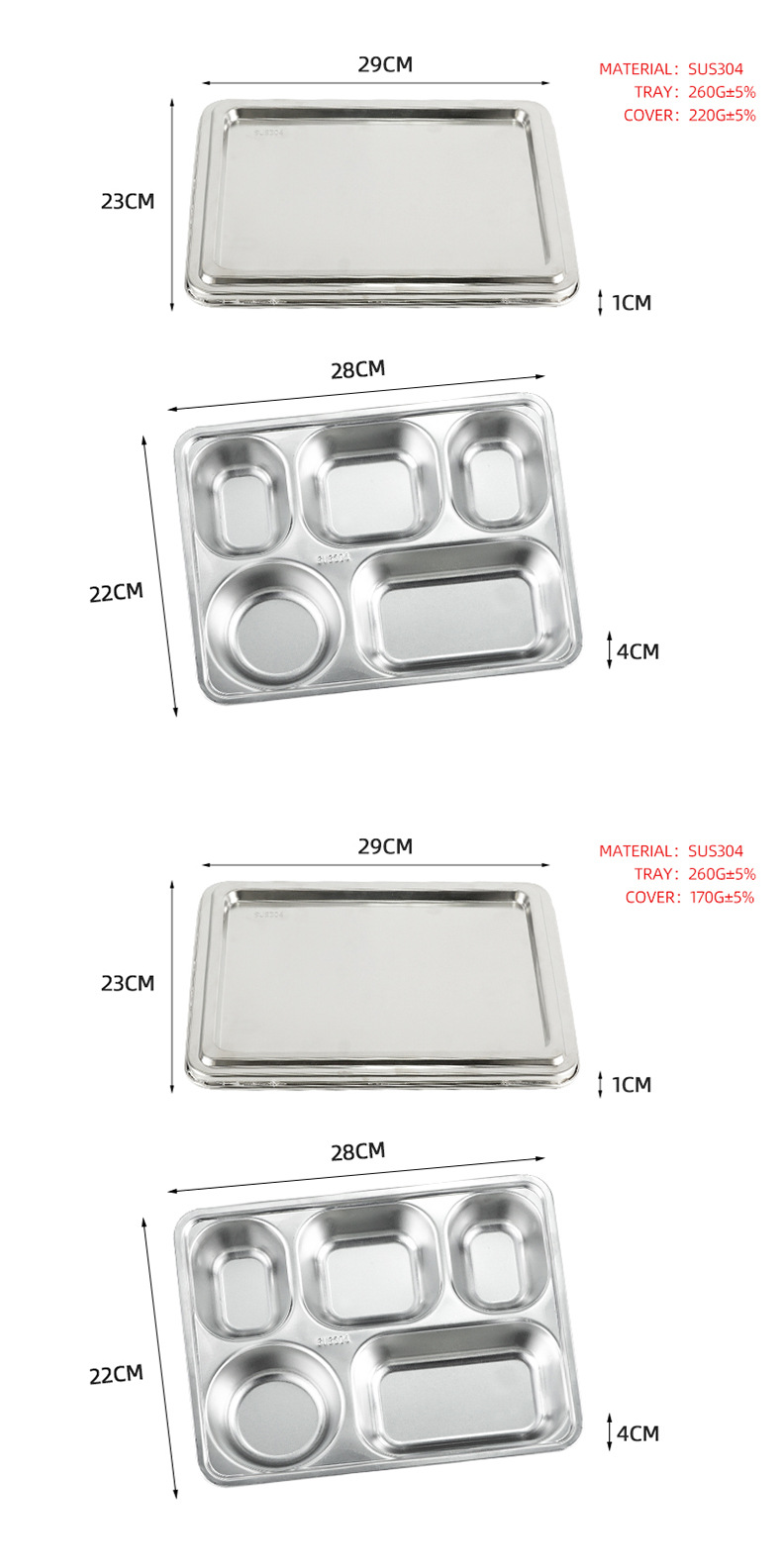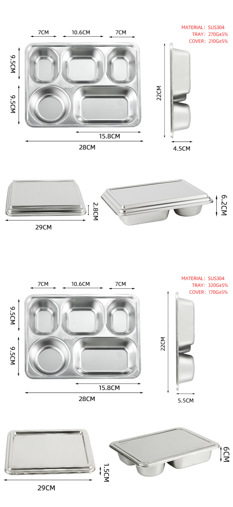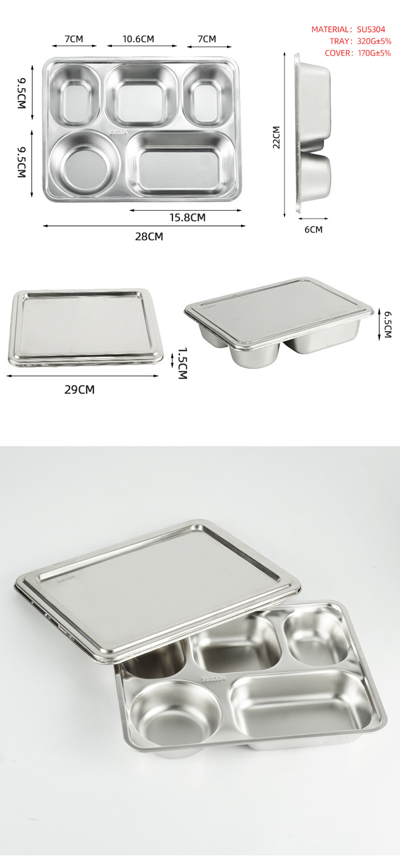 蓋付き深型5コンパートメントランチボックス、ステンレス製コンパートメントファーストフードプレート、スクエア学生サービングプレート、304ステンレス製サービングプレート