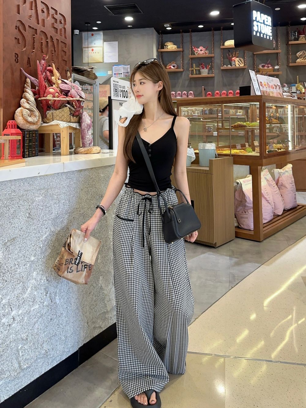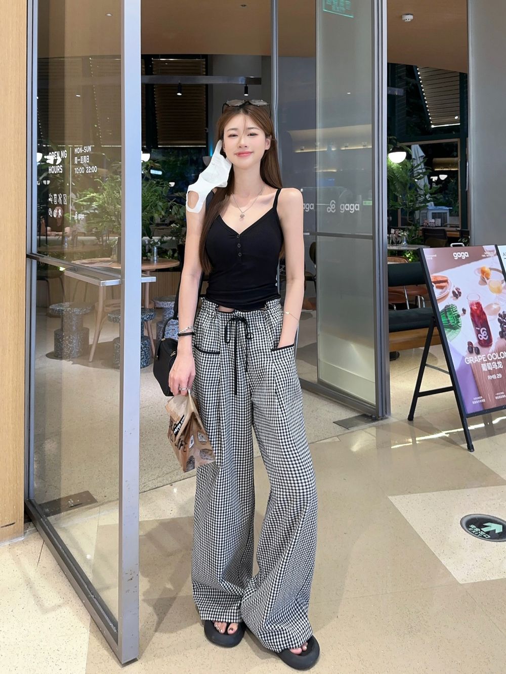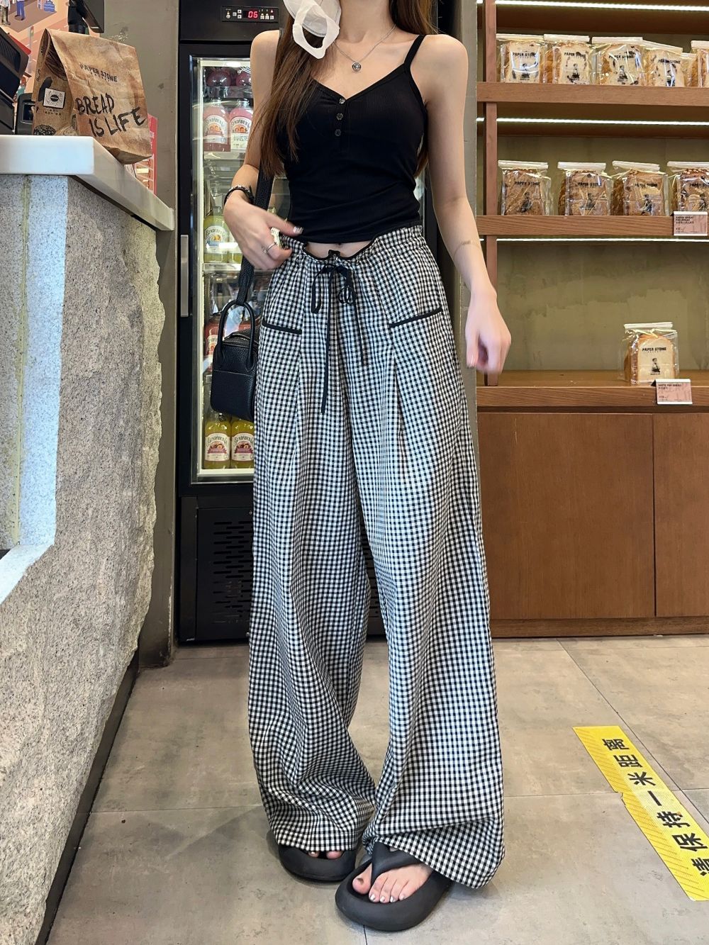 夏用の女性用花柄チェック柄ワイドレッグパンツ、薄くて多用途、ゆったり、スリム、レトロなデザイン、ストレートレッグカジュアルパンツ