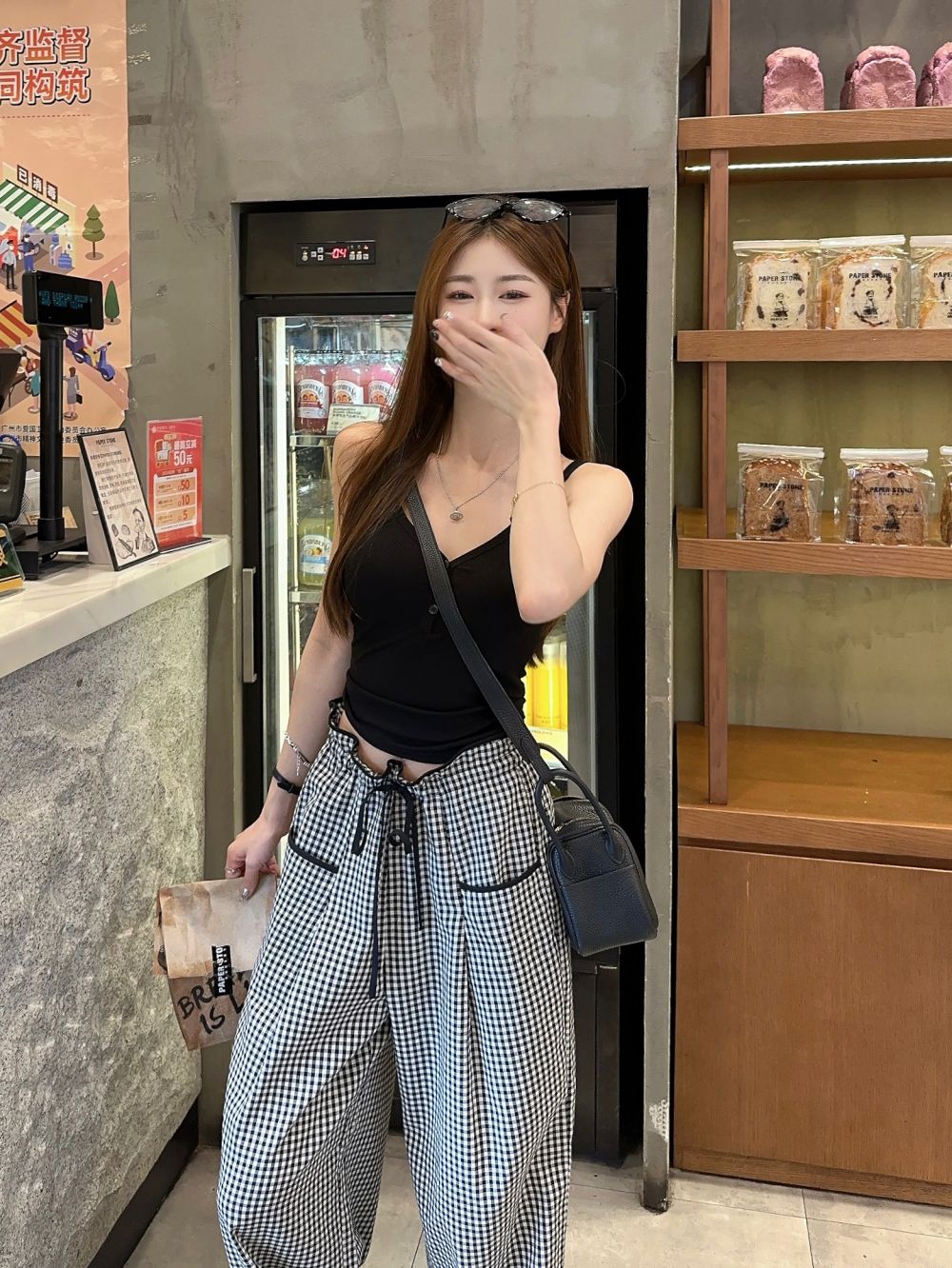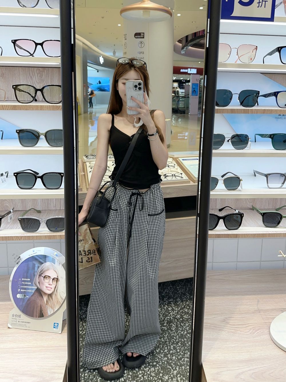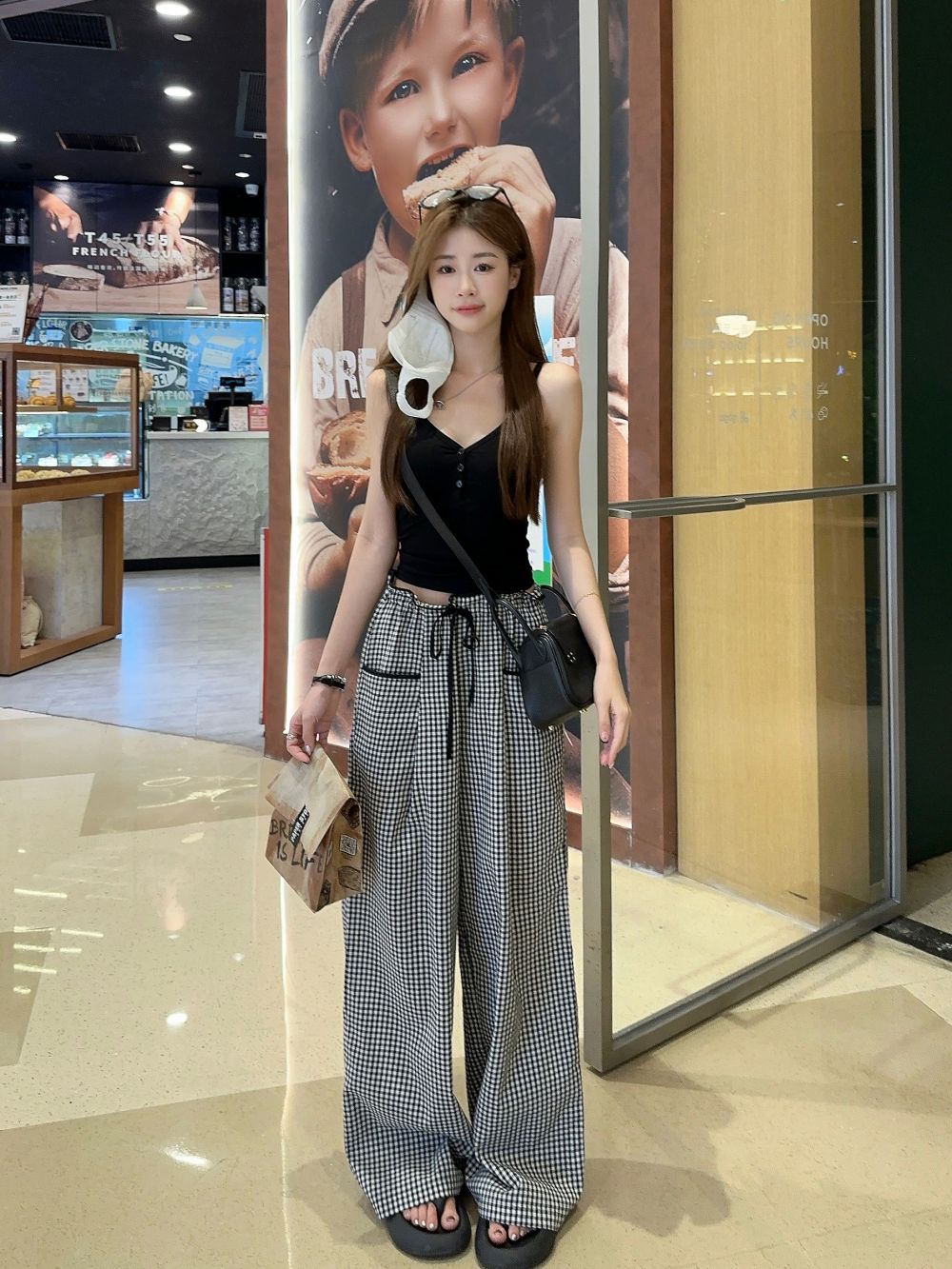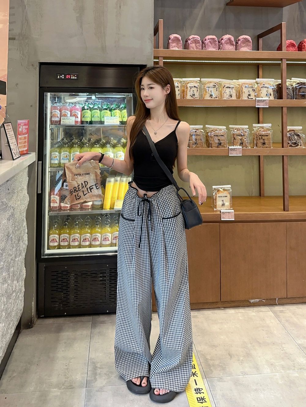夏用の女性用花柄チェック柄ワイドレッグパンツ、薄くて多用途、ゆったり、スリム、レトロなデザイン、ストレートレッグカジュアルパンツ