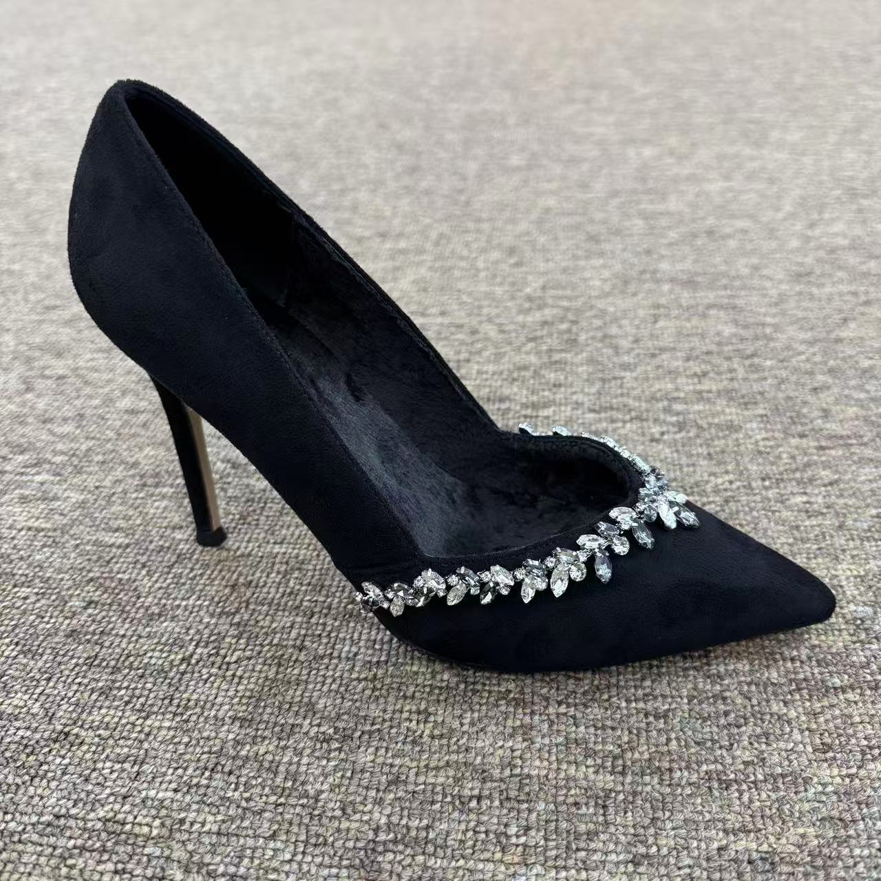 ソリッドカラースエードダイヤモンドストリップシューズフレンチハイヒール女性セレブ気質ドレス宴会ポインテッドトゥスティレットヒール浅い口黒