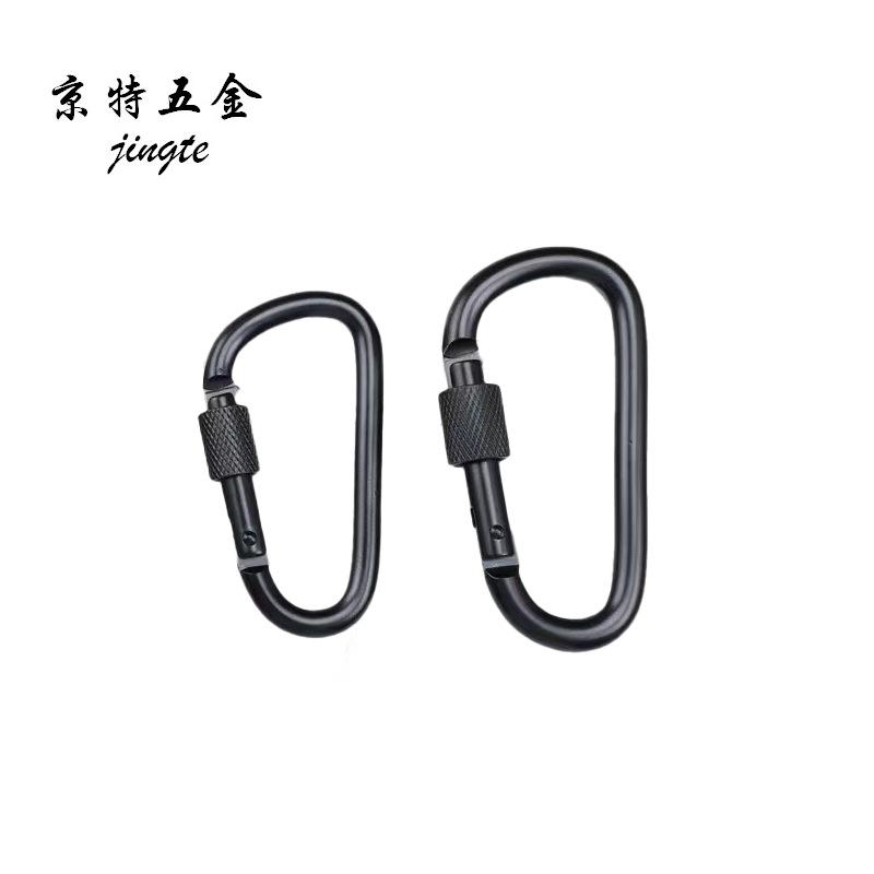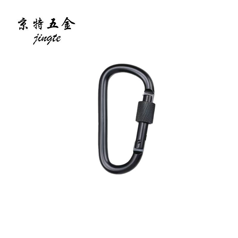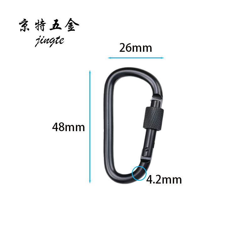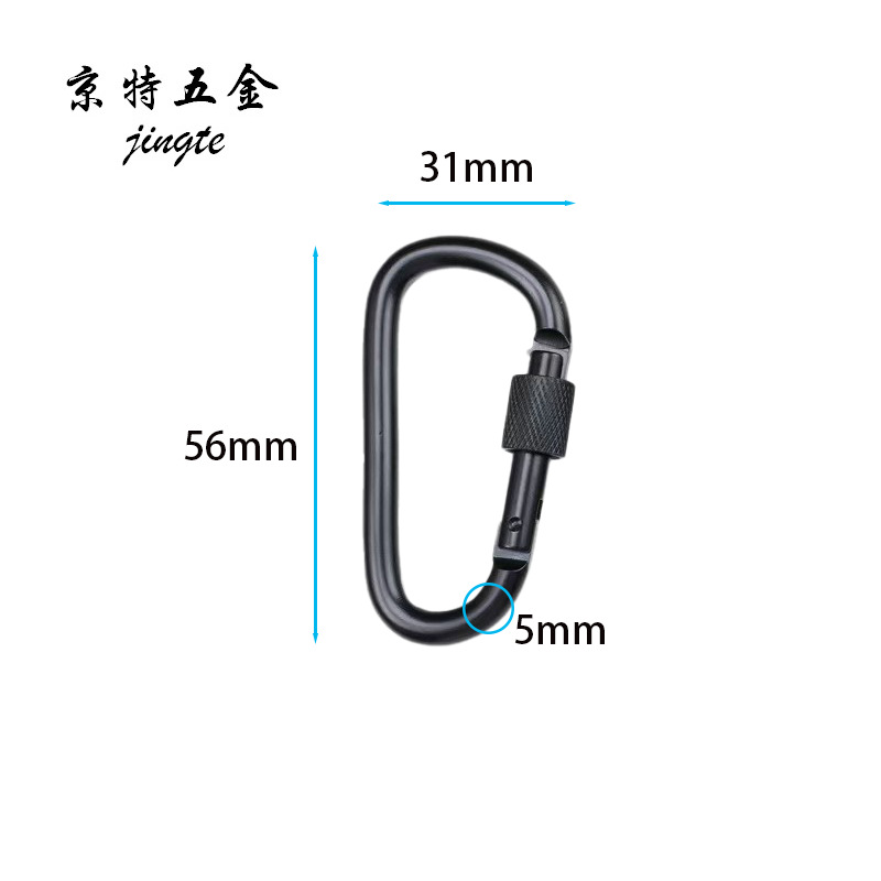 電気泳動加工の黒色D型ロック式登山用カラビナ、厚めのアウトドア用吊り下げ金具、ネジキャップ付きアルミニウム合金製キーホルダー、滑り止め