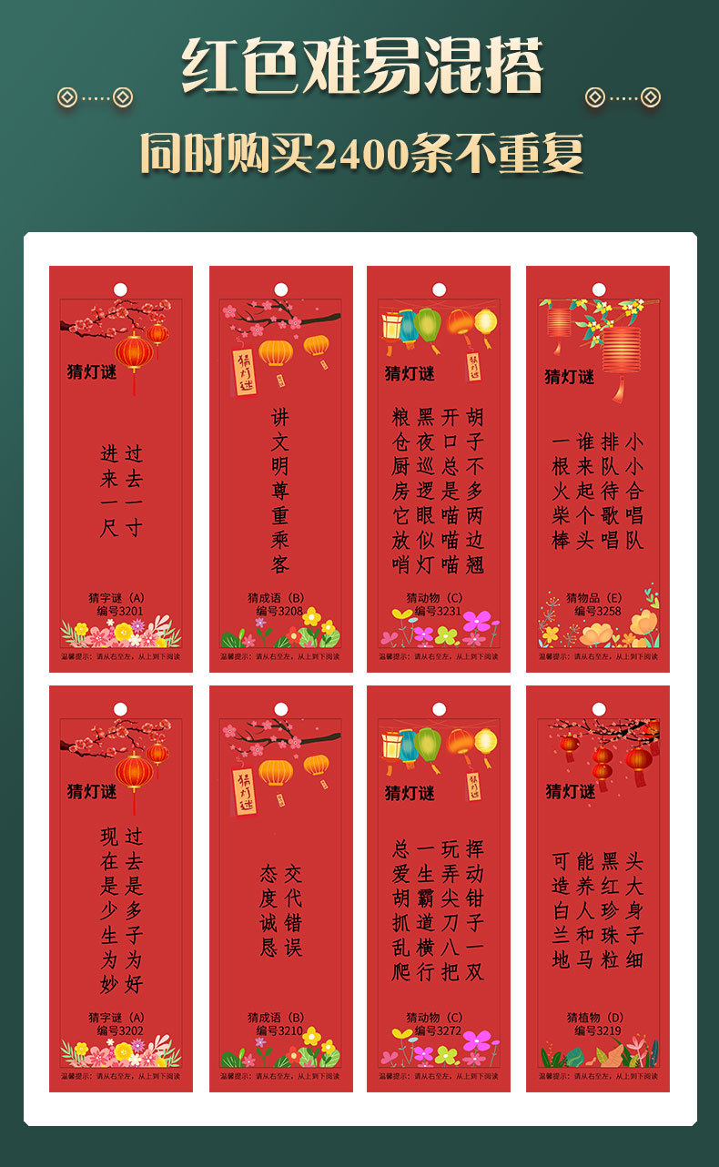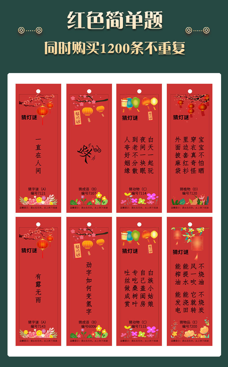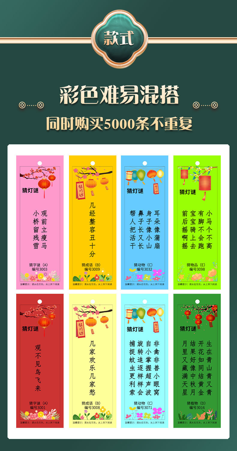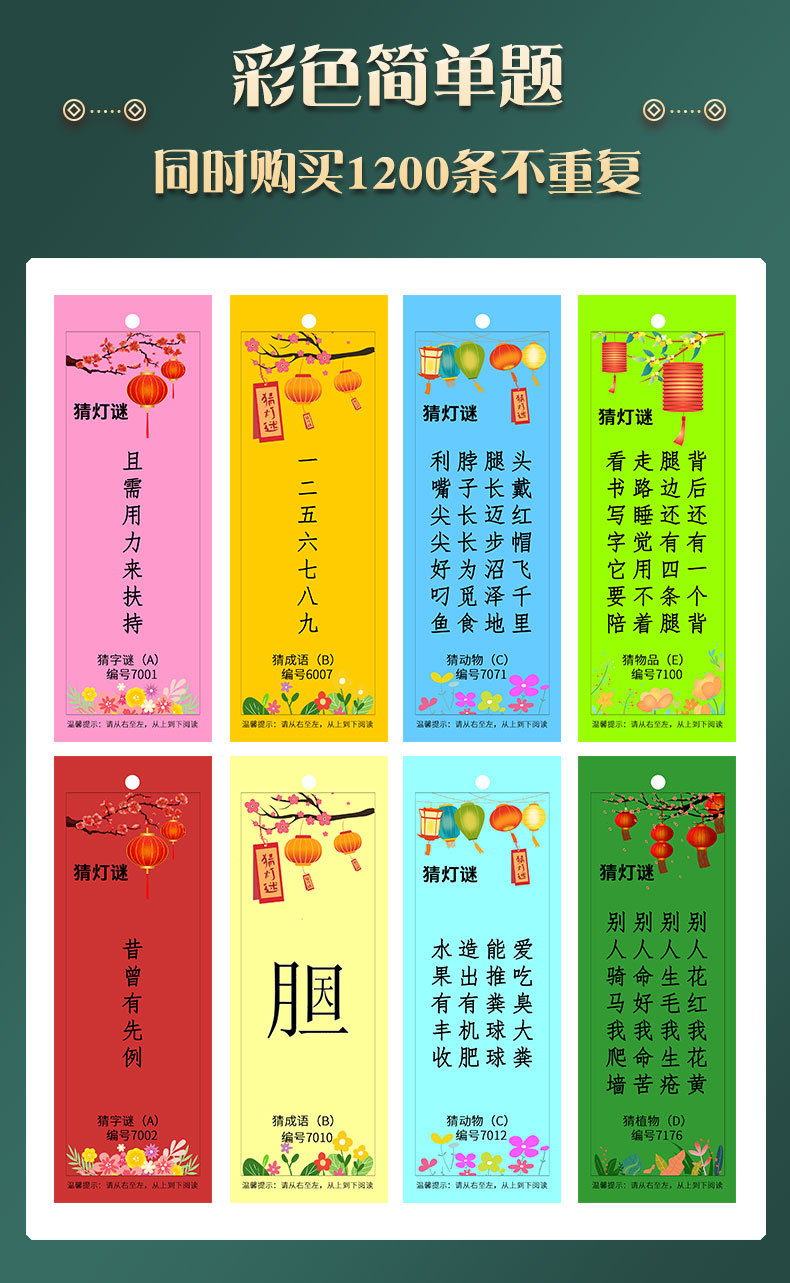 颜色 彩色难易混搭题100张,红色难易混搭题100张,彩色简单题100张,红色简单题100张,古风灯谜20张(300克加厚硬卡纸),古风灯谜50张(300克加厚硬卡纸),古风灯谜100张(300克加厚硬卡纸),古风灯谜+流苏20张(300克加厚硬卡纸),古风灯谜+流苏50张(300克加厚硬卡纸),古风灯谜+流苏100张(300克加厚硬卡纸)