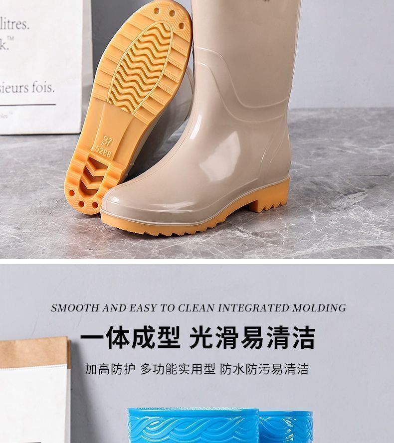 高筒雨靴さんファッション外は滑り止め防水の厚い底のゴム靴を履いています。