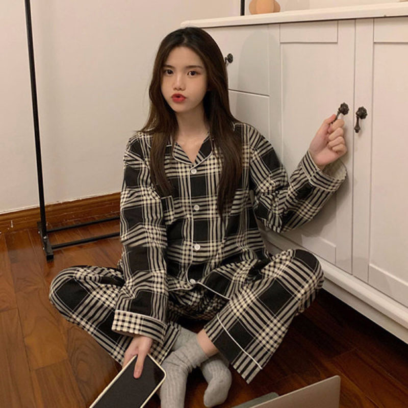 女性パジャマセット韓国スタイルチェック柄長袖ズボンパジャマプラスサイズカーディガンヴィンテージホームウェアツーピースパジャマ