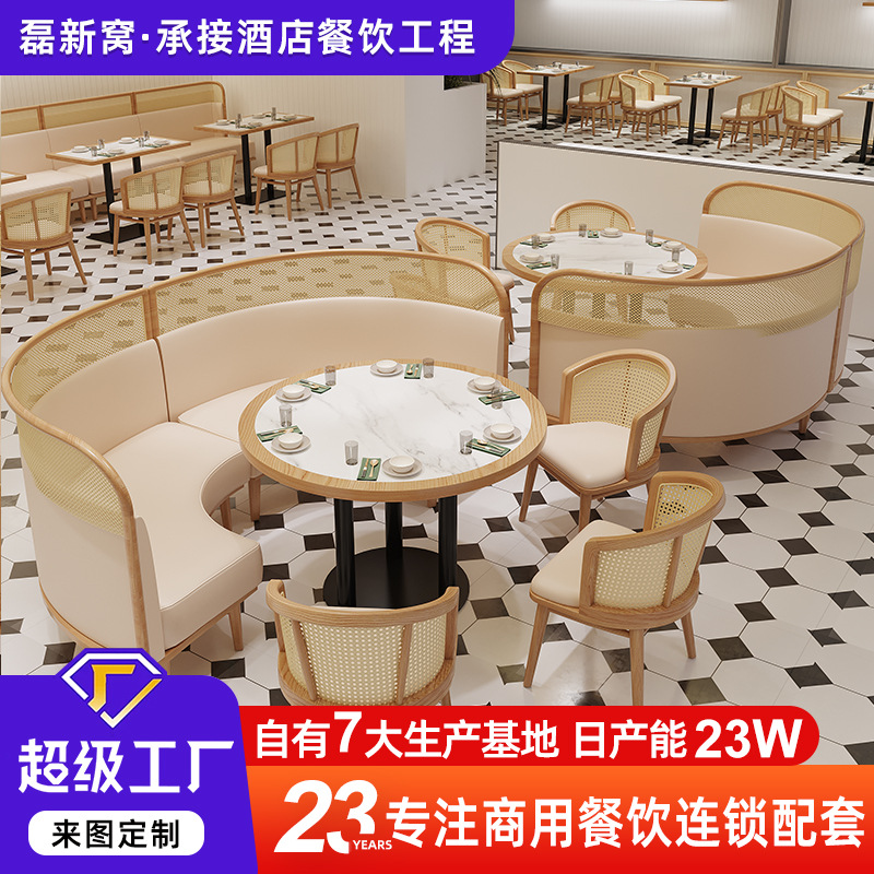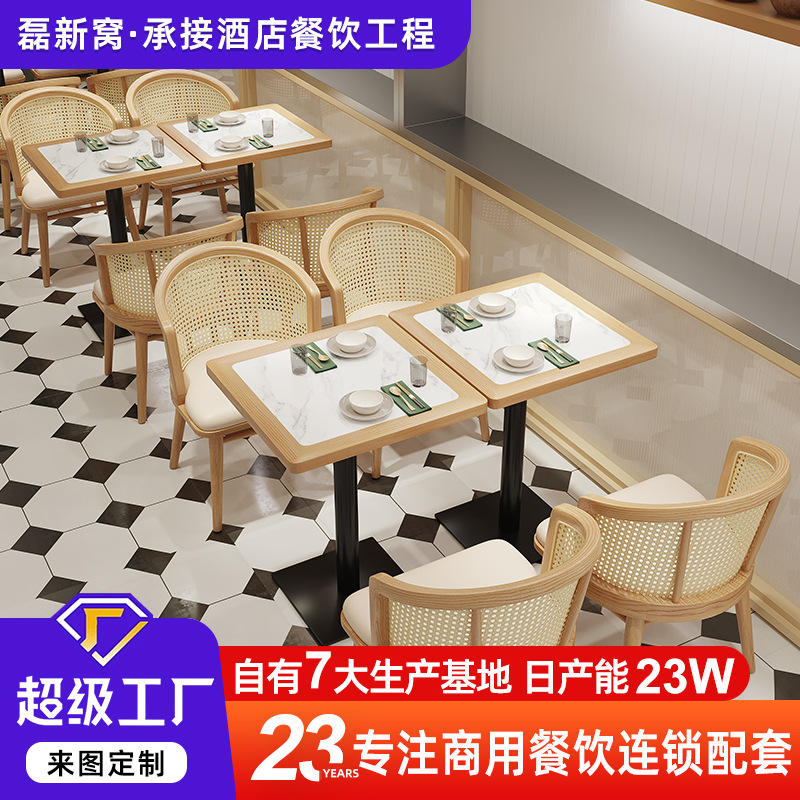 東南アジア風の壁掛け岩板ダイニングテーブル、レトロなスタイルの無垢材籐製カウチ、ネット有名人の鍋レストランのダイニングテーブルと椅子の組み合わせ