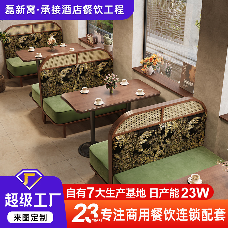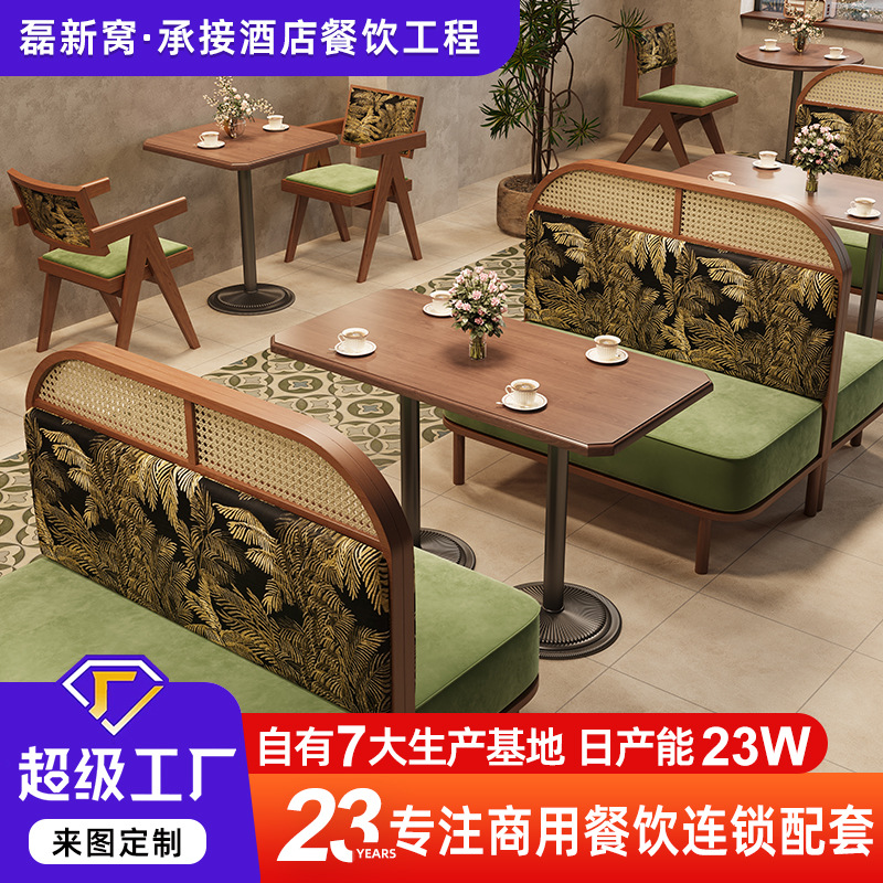 東南アジアの洋食レストランカスタマイズされた壁掛け無垢材籐カウチレトロフュージョン料理カフェダイニングテーブルと椅子の組み合わせ
