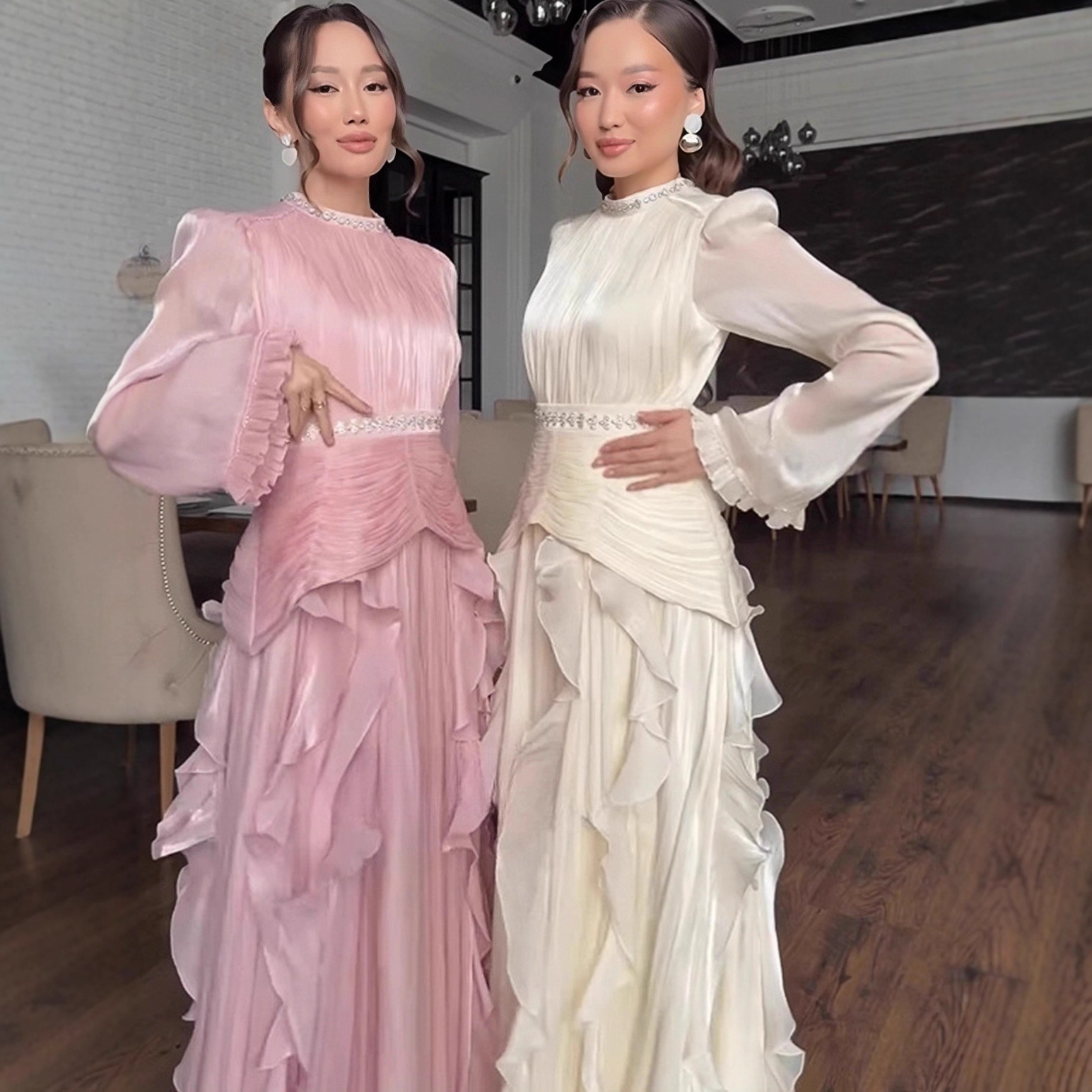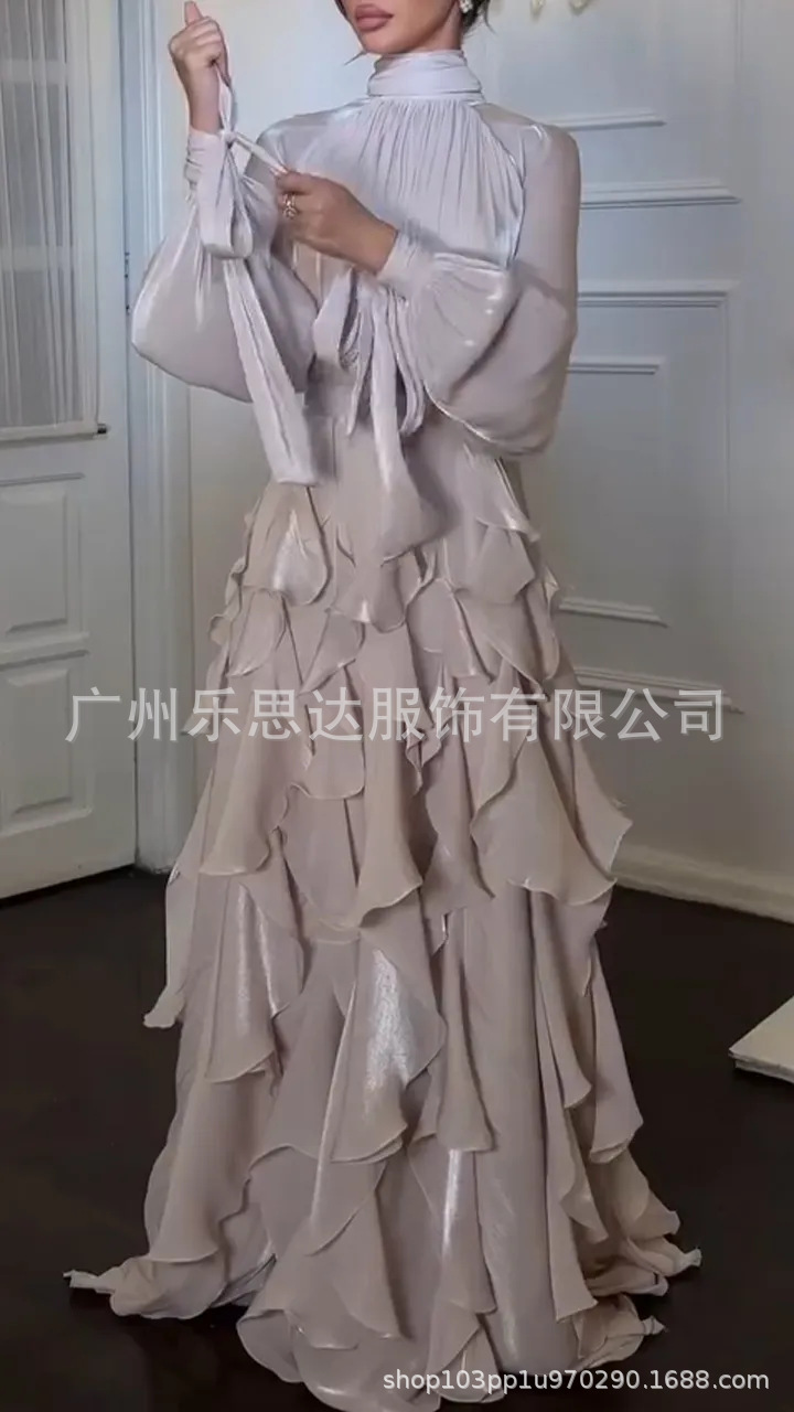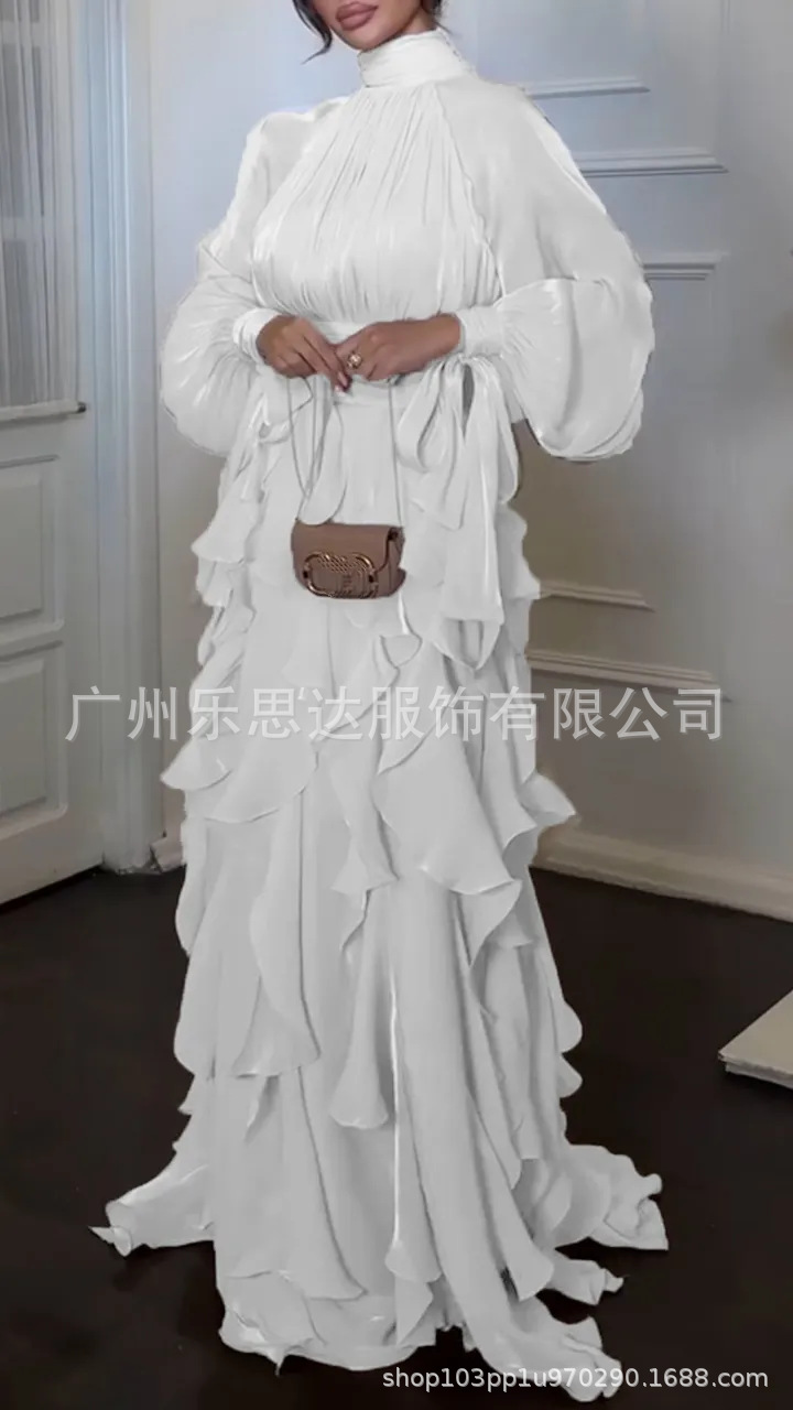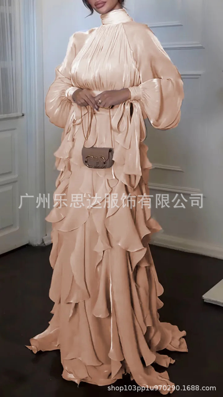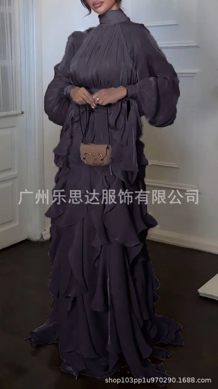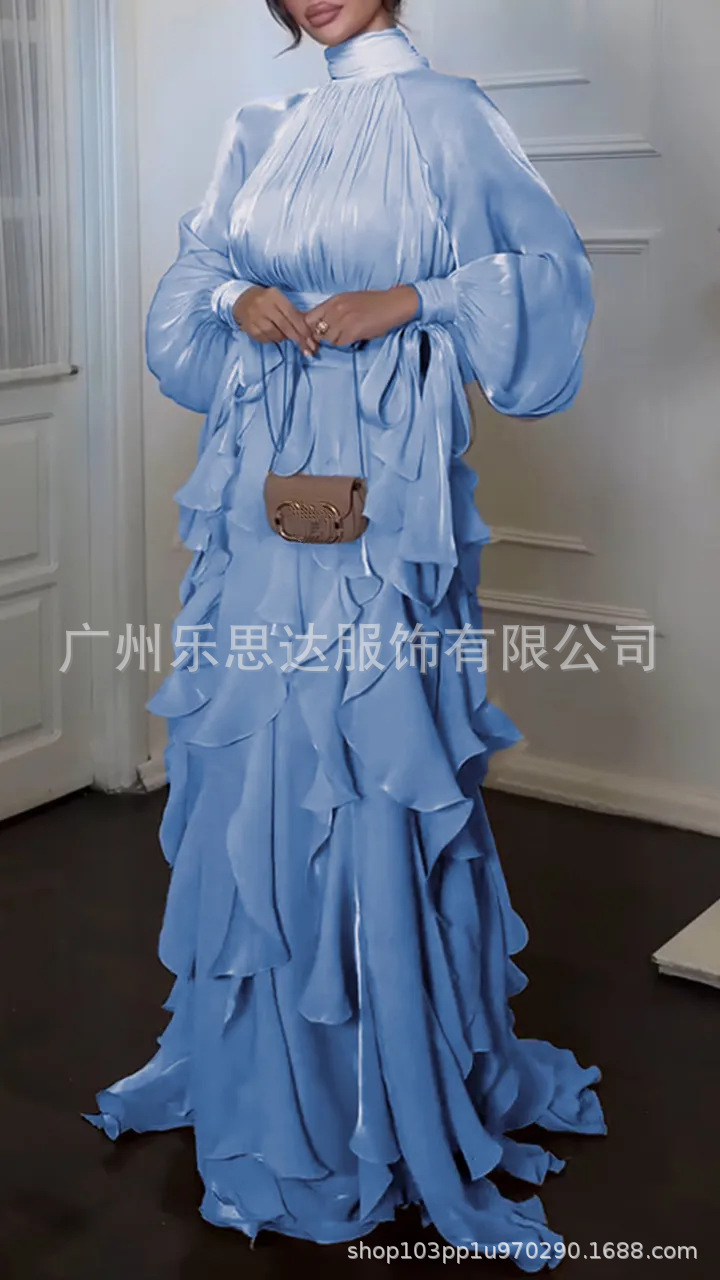 跨境欧美外贸女装2025秋季新款高领长袖荷叶边装饰收腰宴会连衣裙
