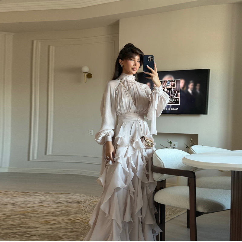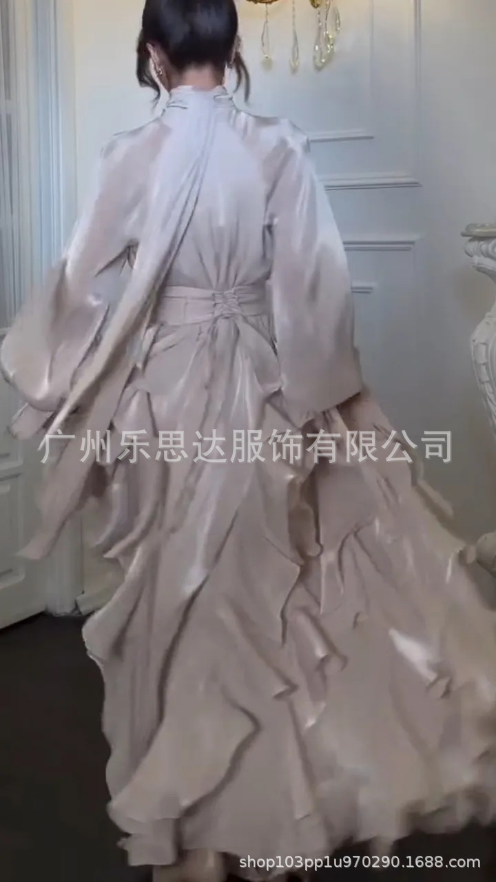 2025春夏新款跨境外贸女装雪纺压褶波浪礼服法式荷叶边长袖连衣裙