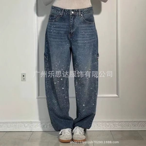 大量の既製春夏新作アマゾン独立系ヨーロッパとアメリカのクロスボーダーレディースカジュアルラインストーンルーズハーレムジーンズ
