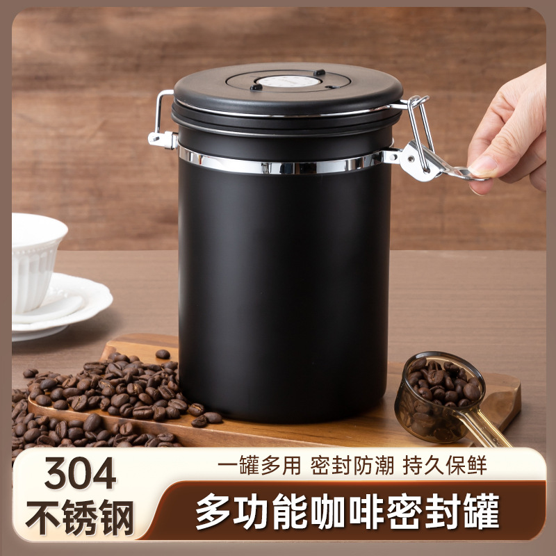 加厚304不锈钢密封罐带排气阀储物罐咖啡豆保鲜罐带勺子茶叶罐子