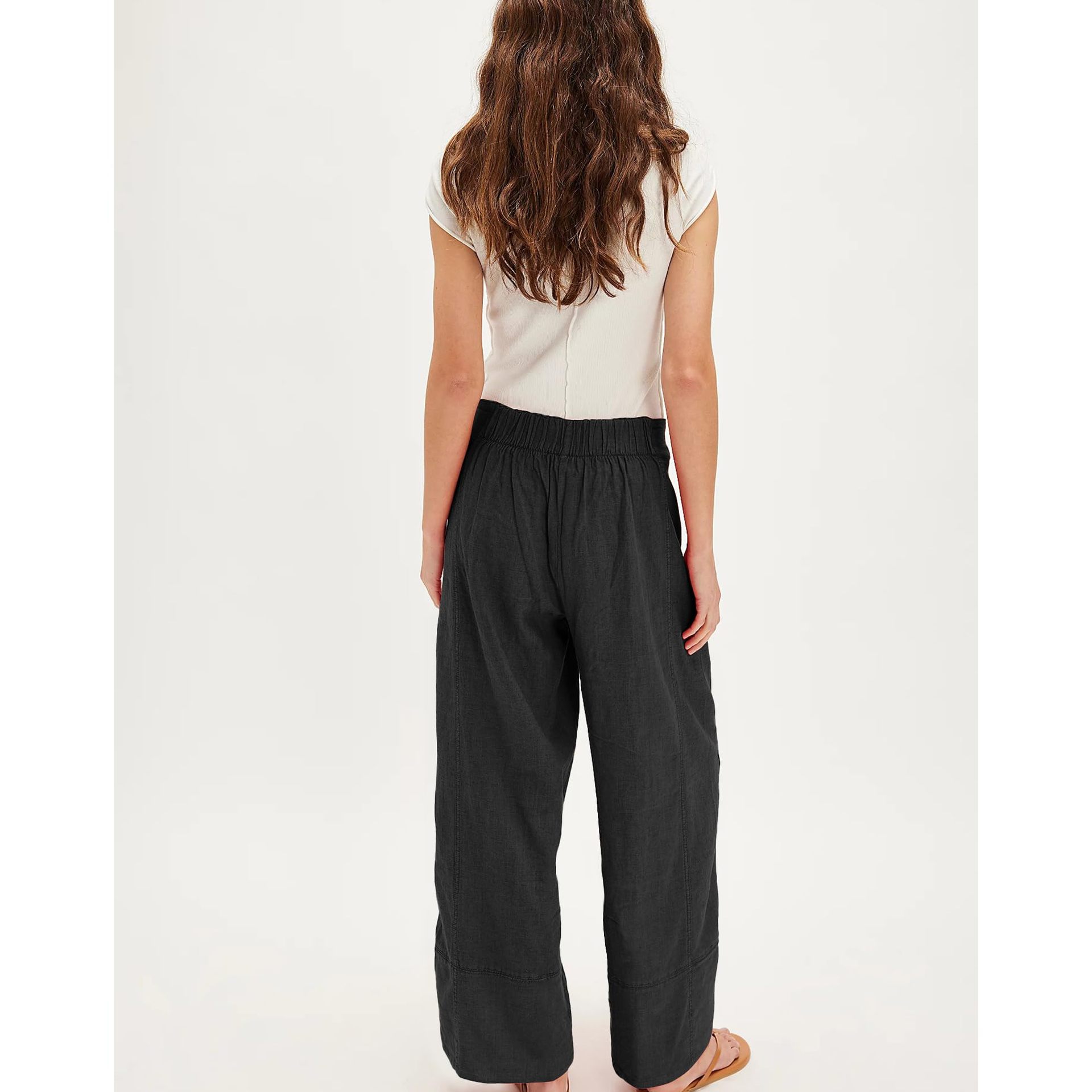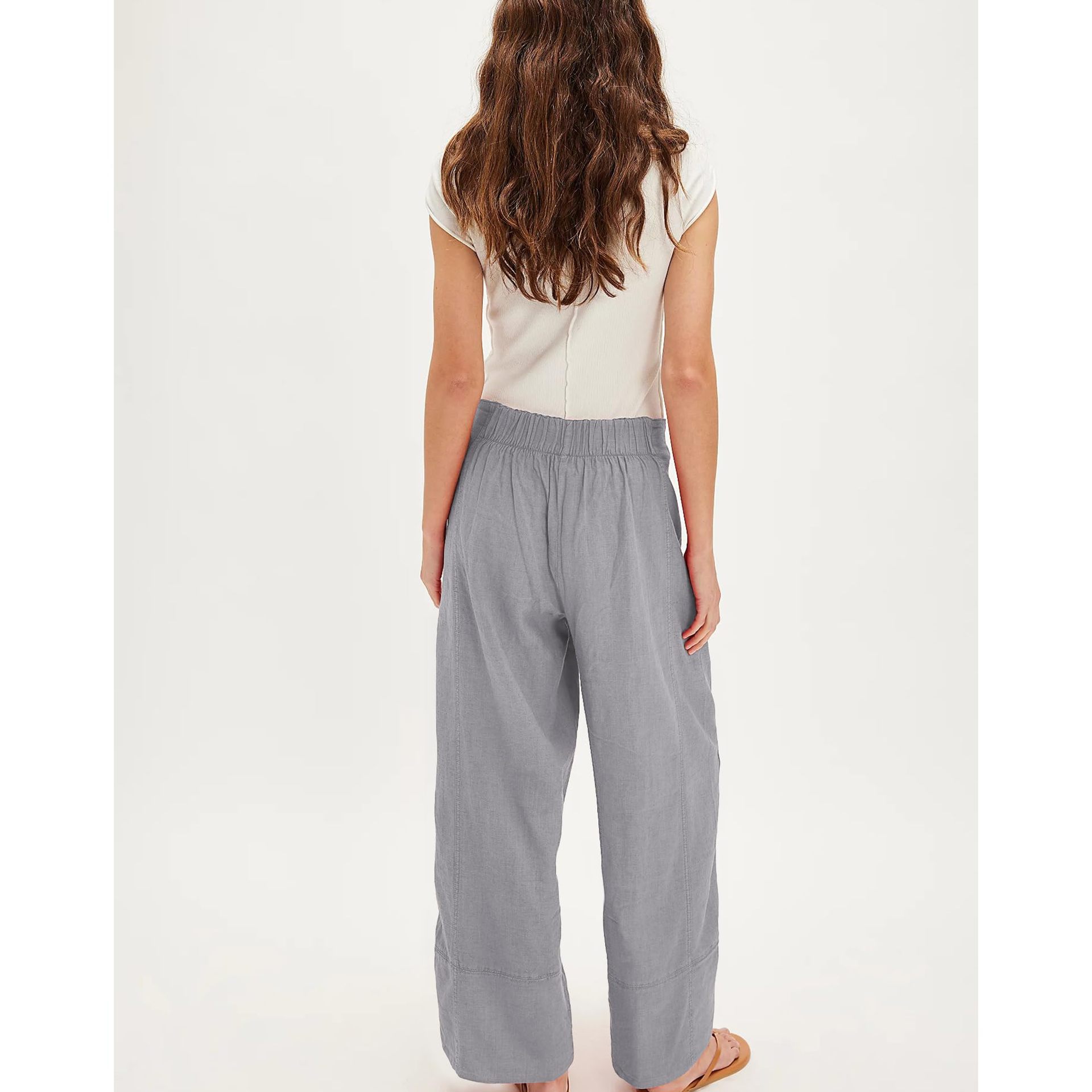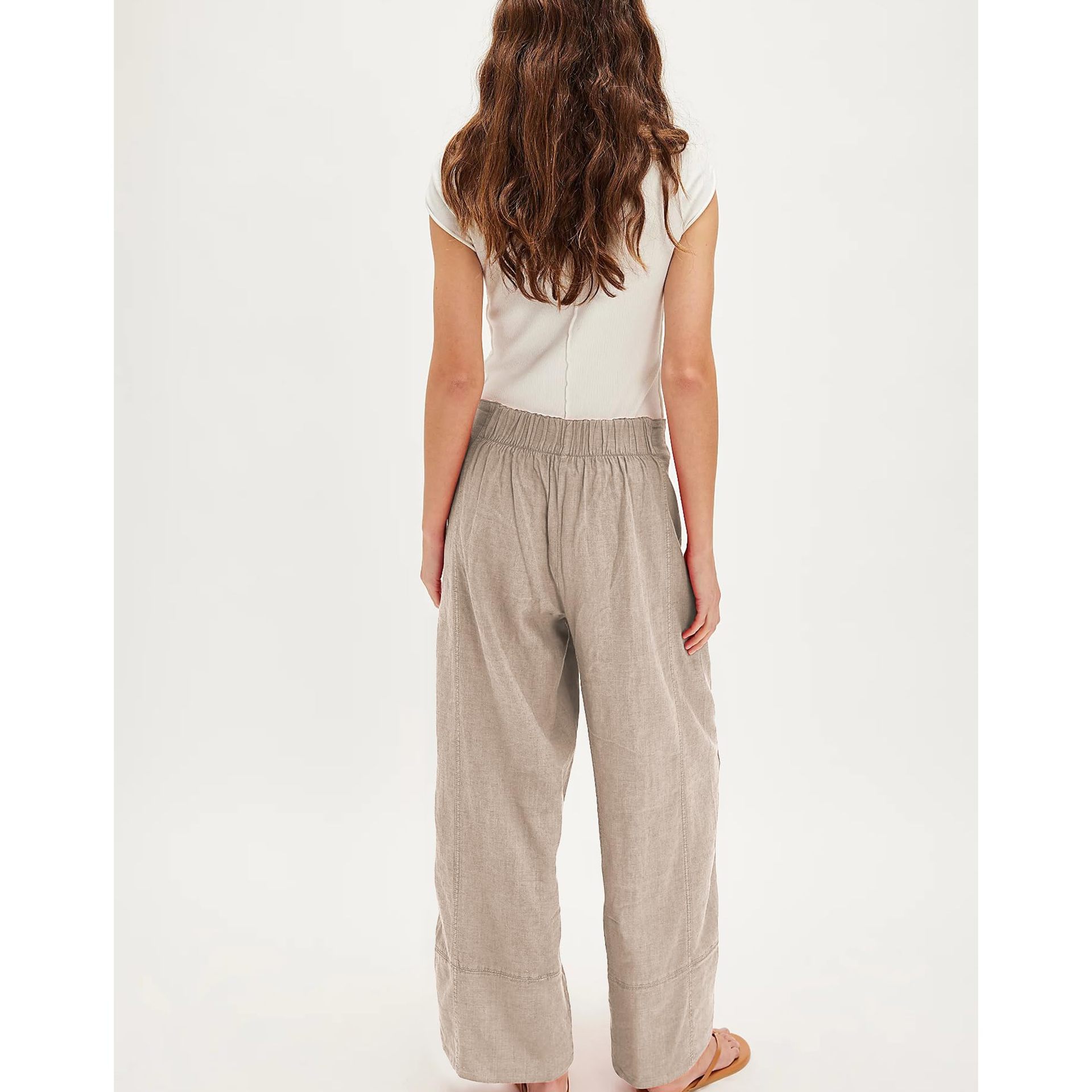 跨境女式休闲阔腿亚麻裤松紧中腰裤带口袋舒适飘逸阔腿沙滩裤女