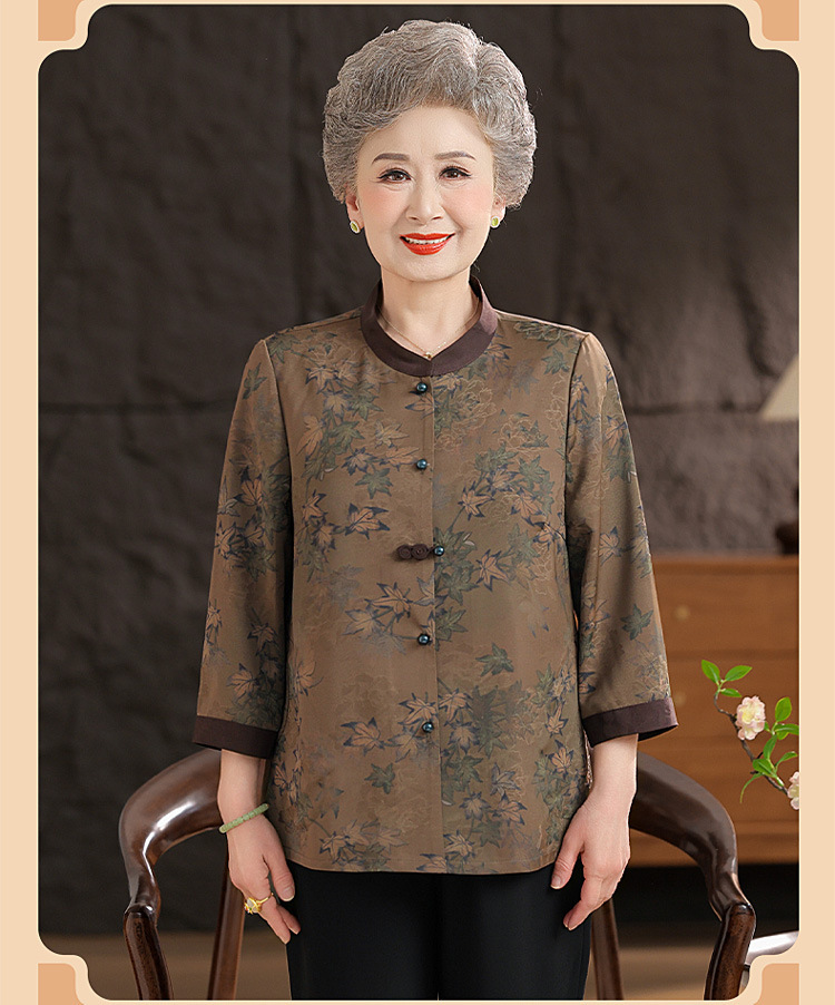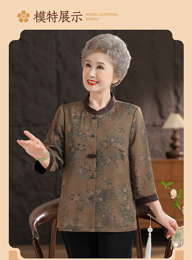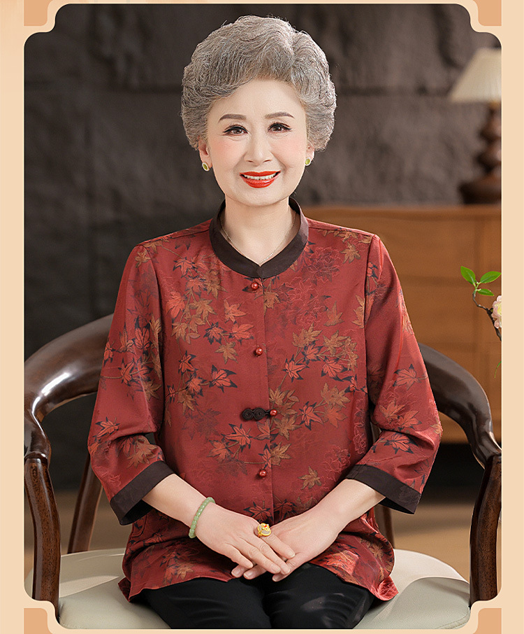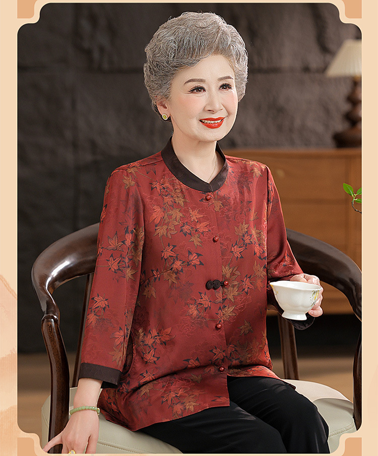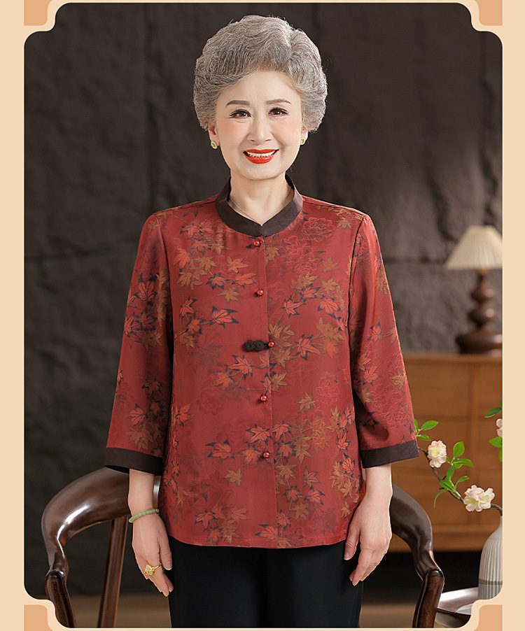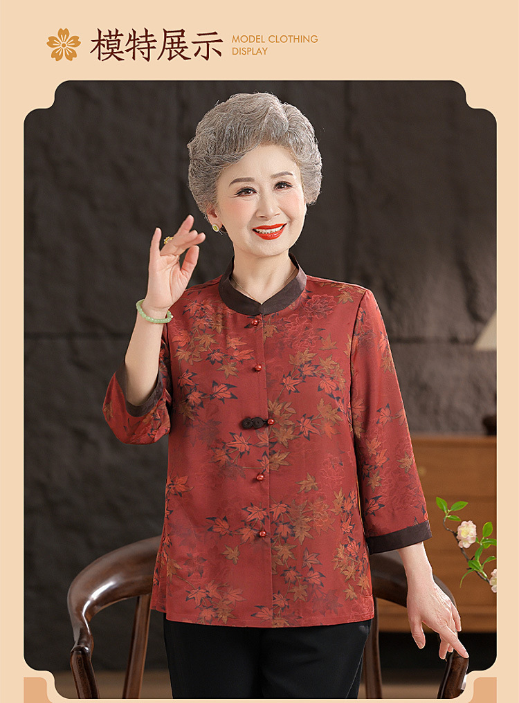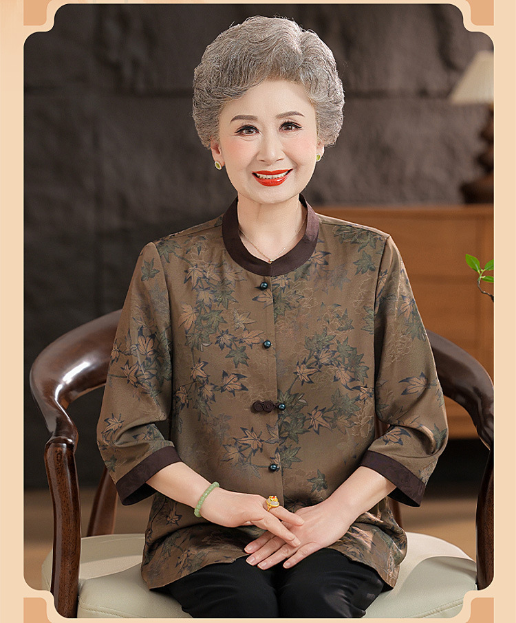 おばあちゃんの夏服、中国風模造シルクシャツ、中高年の母親、高級唐服、おばさん七分袖シャツ