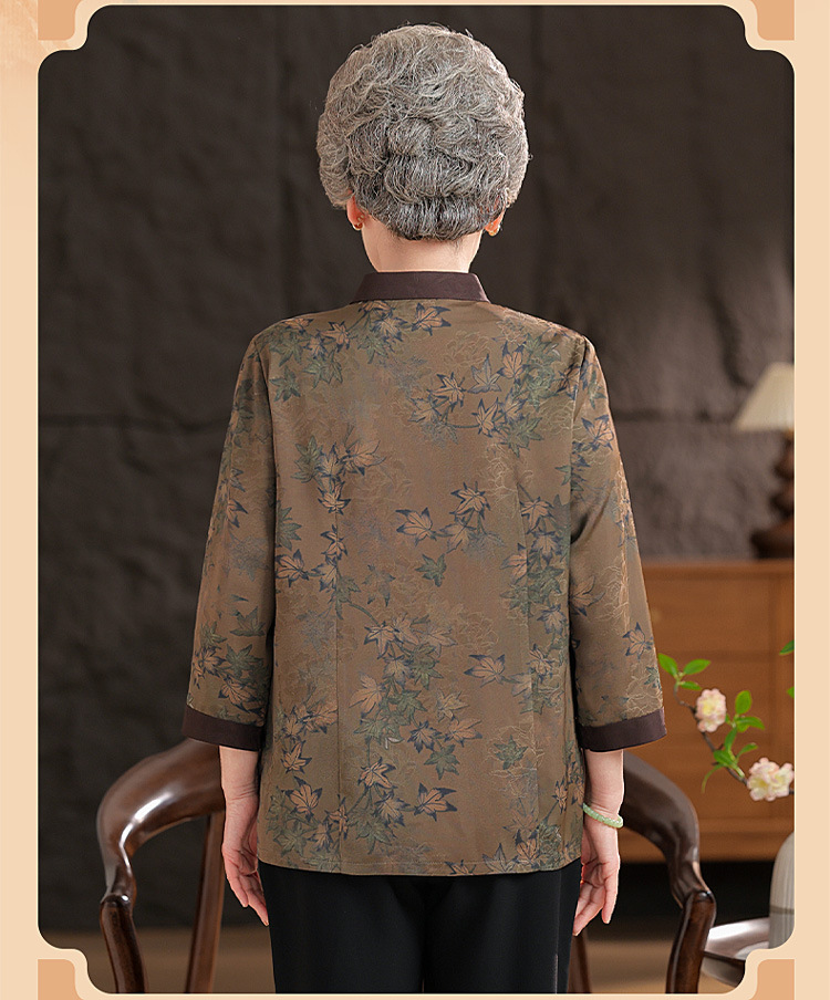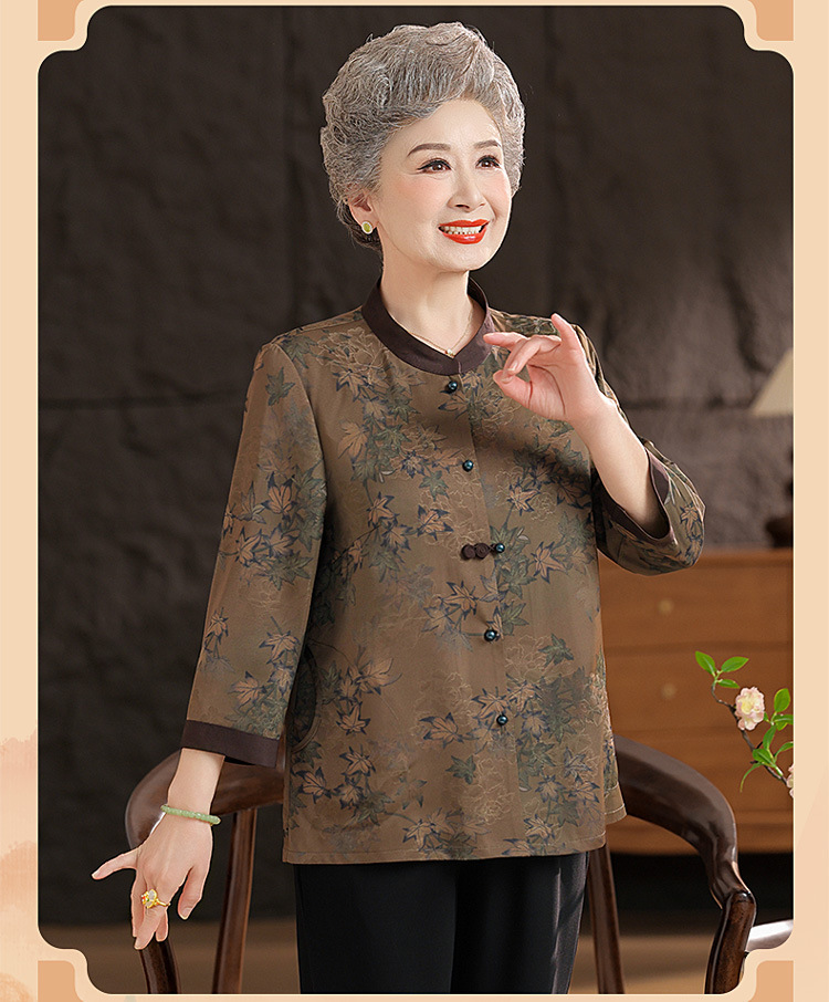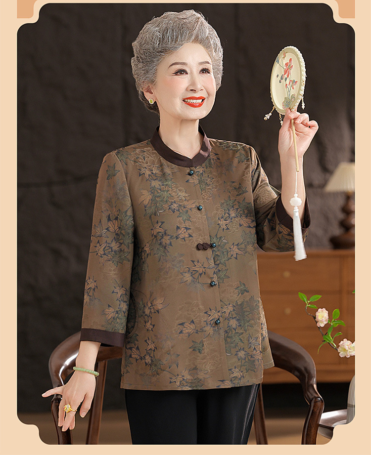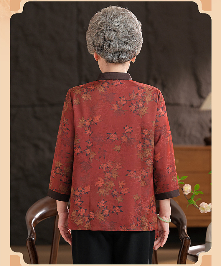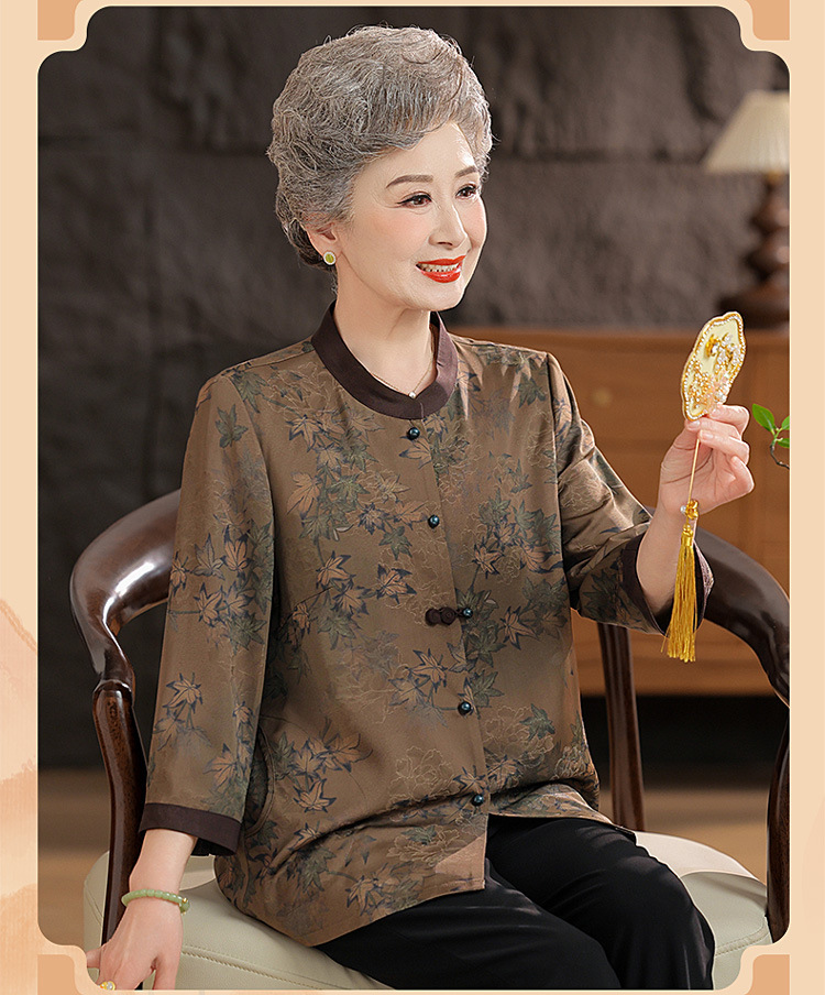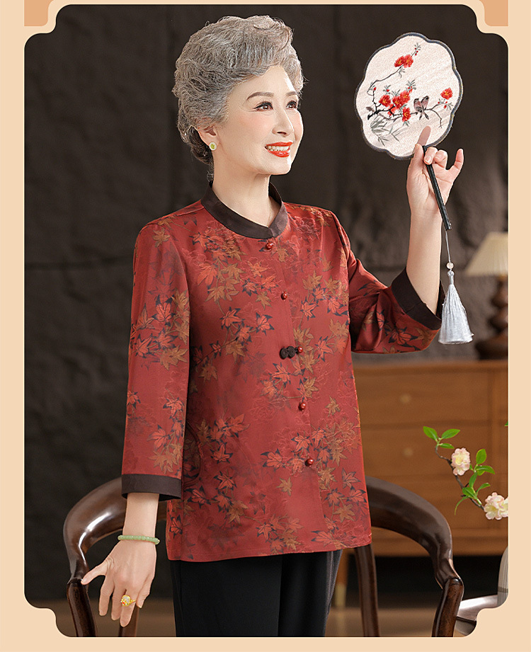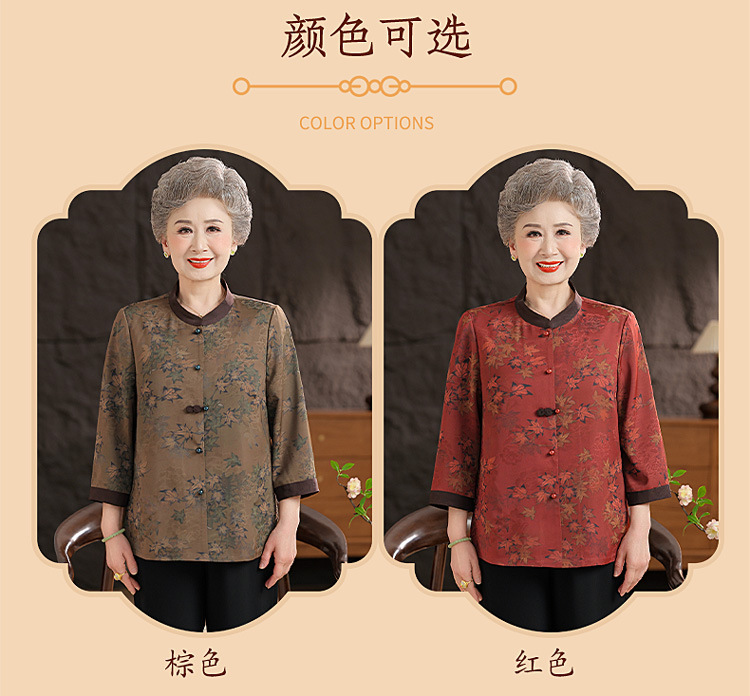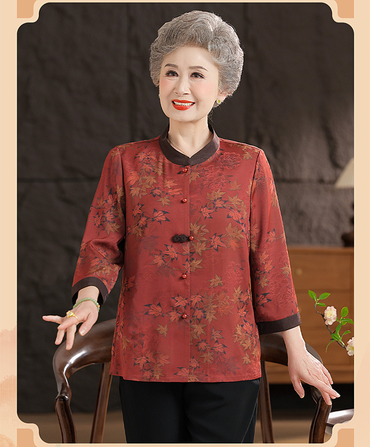 おばあちゃんの夏服、中国風模造シルクシャツ、中高年の母親、高級唐服、おばさん七分袖シャツ