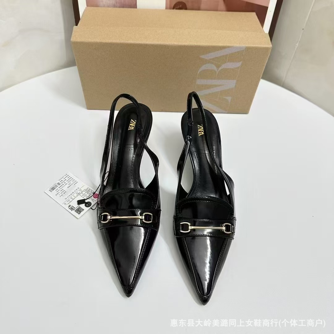 西班牙ZA家尖头带饰扣黑色高跟鞋2025新款时尚气质后空细跟单鞋女
