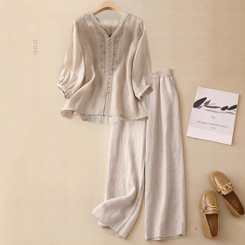 亚麻套装女夏重工刺绣v领短袖衬衫上衣休闲阔腿九分裤棉麻两件套
