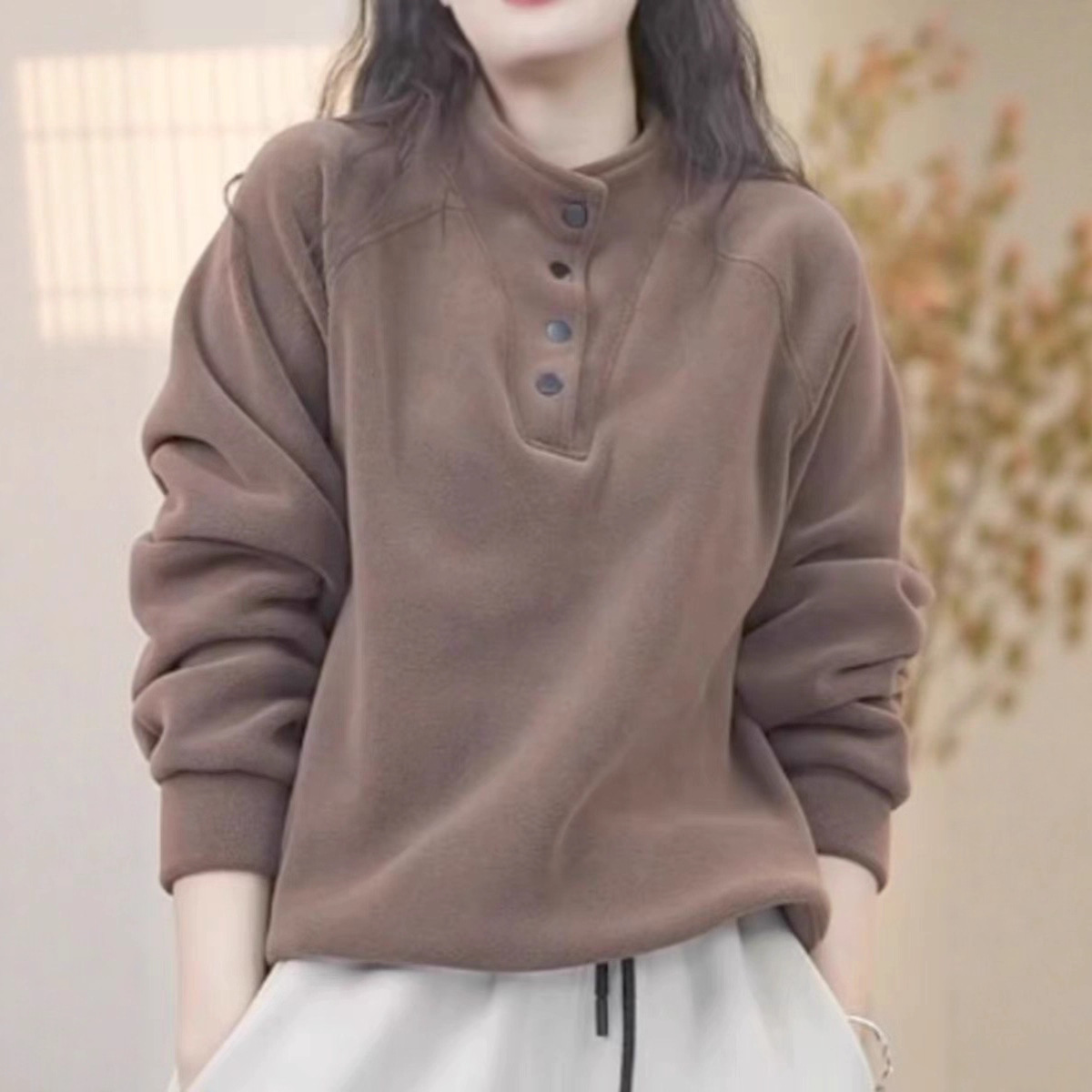 德绒卫衣女士2025秋冬新款纽扣立领宽松大码内搭加绒保暖长袖上衣