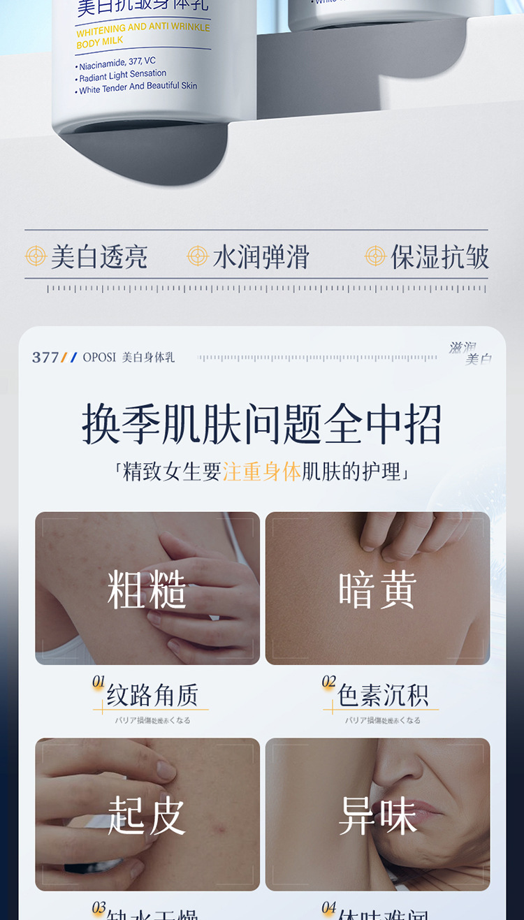 377美白抗シワボディローション、フルーツ酸配合で保湿、乾燥肌対策、全身の鶏肌除去、香り長持ち、女性向け卸売
