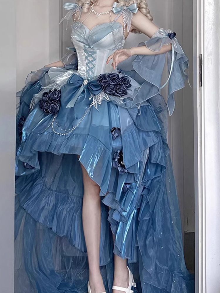 蓝色古董风蛋糕裙 华丽 Lolita裙 洛丽塔洋装重工裙