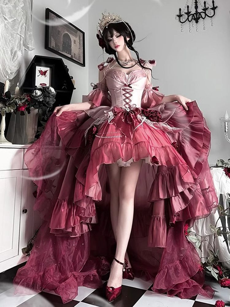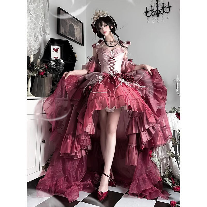 甜美芭蕾风前短后长绝美连衣裙洛丽塔生日礼服重工玫瑰拖尾公主裙