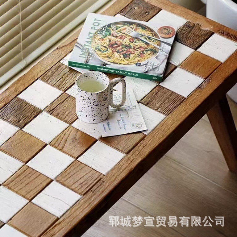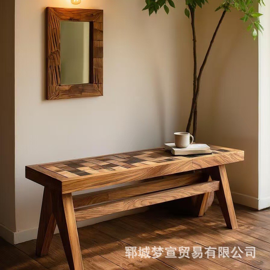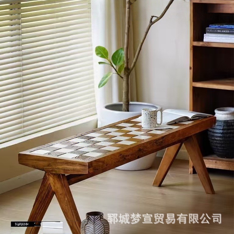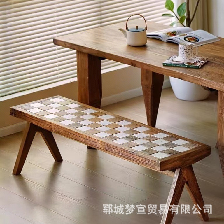 老榆木拼花长条凳入户换鞋凳酒店民宿装饰床尾凳棋盘格餐椅玄关凳