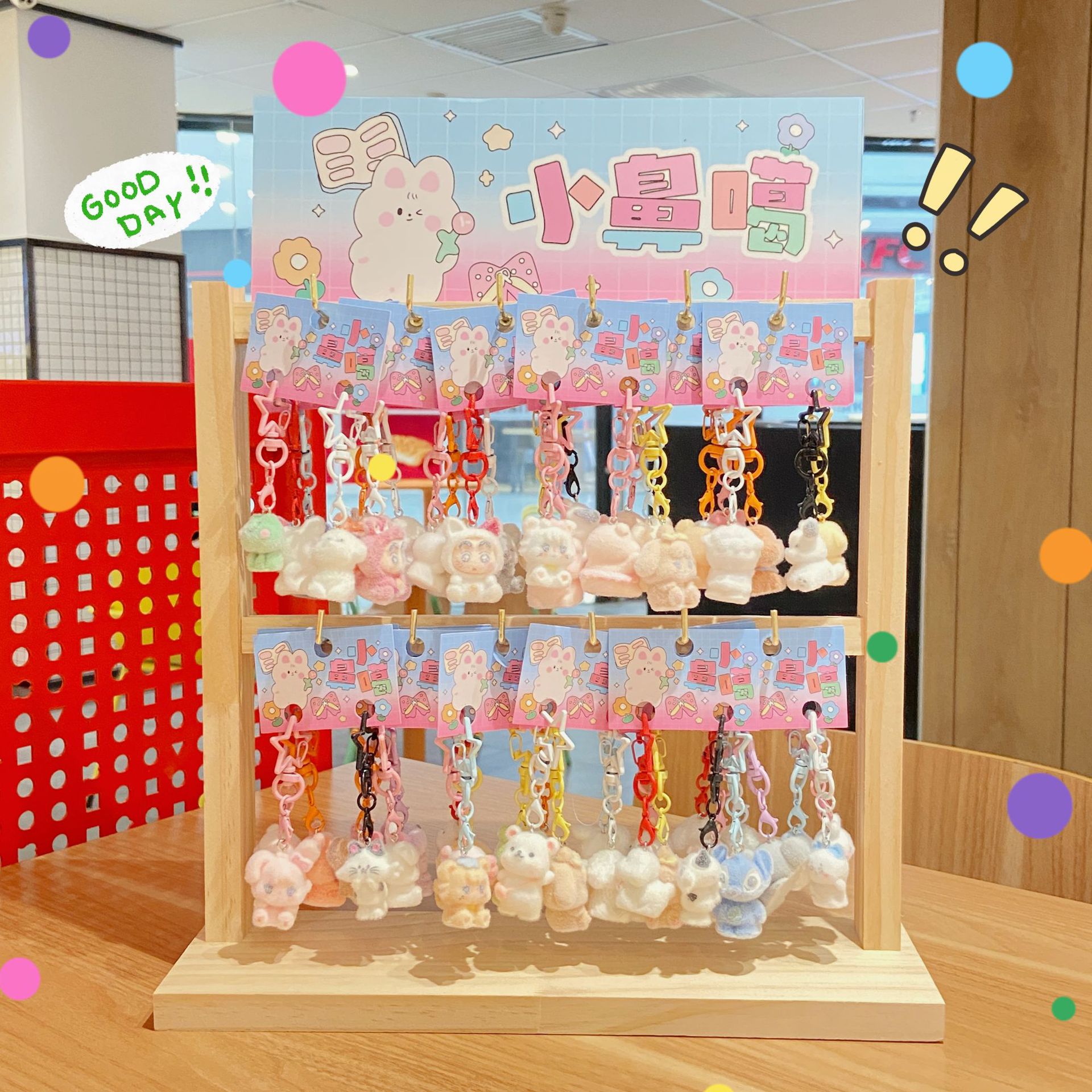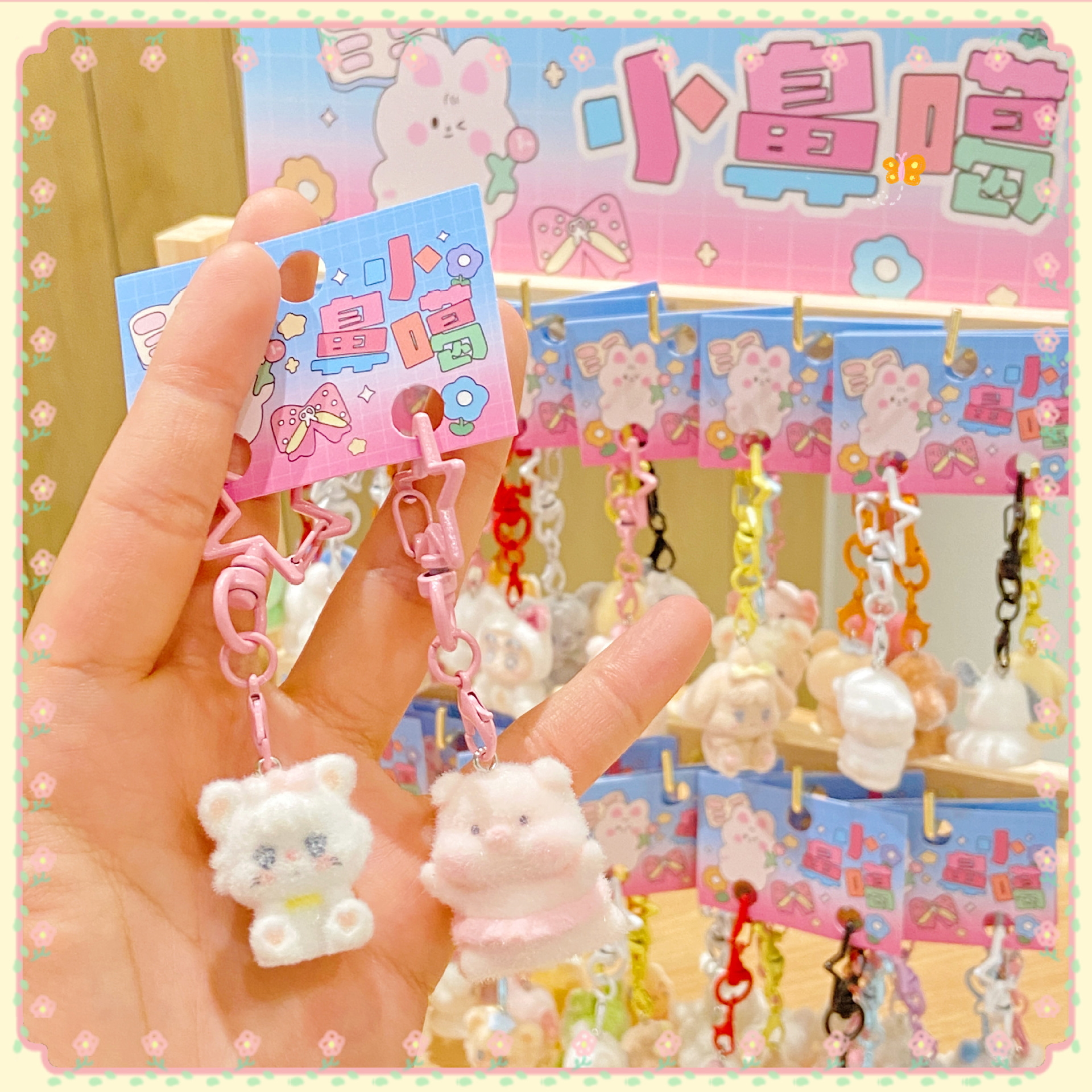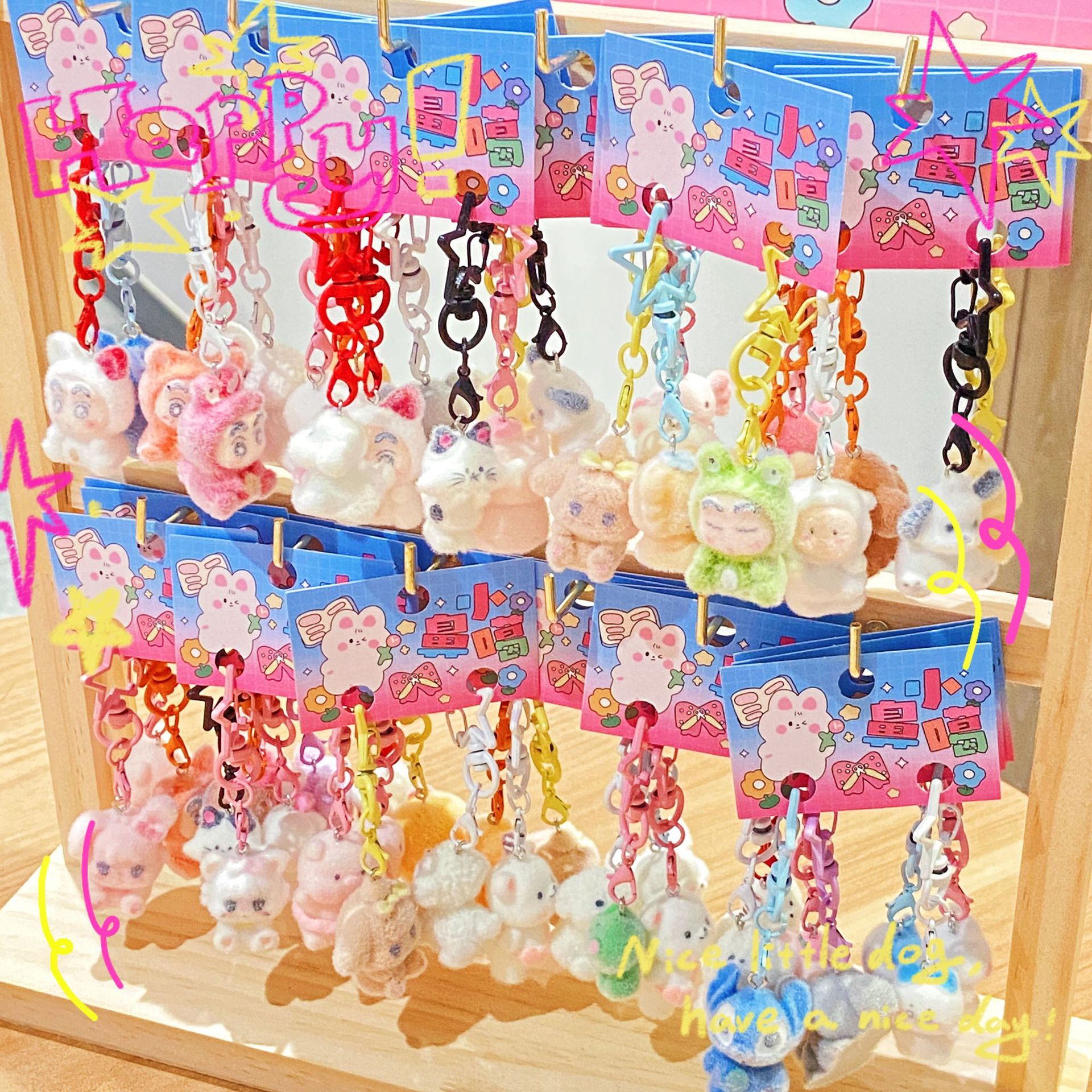 毛茸茸双卡植绒毛球小鼻噶(48卡/架)可爱小挂件创意植绒钥匙扣