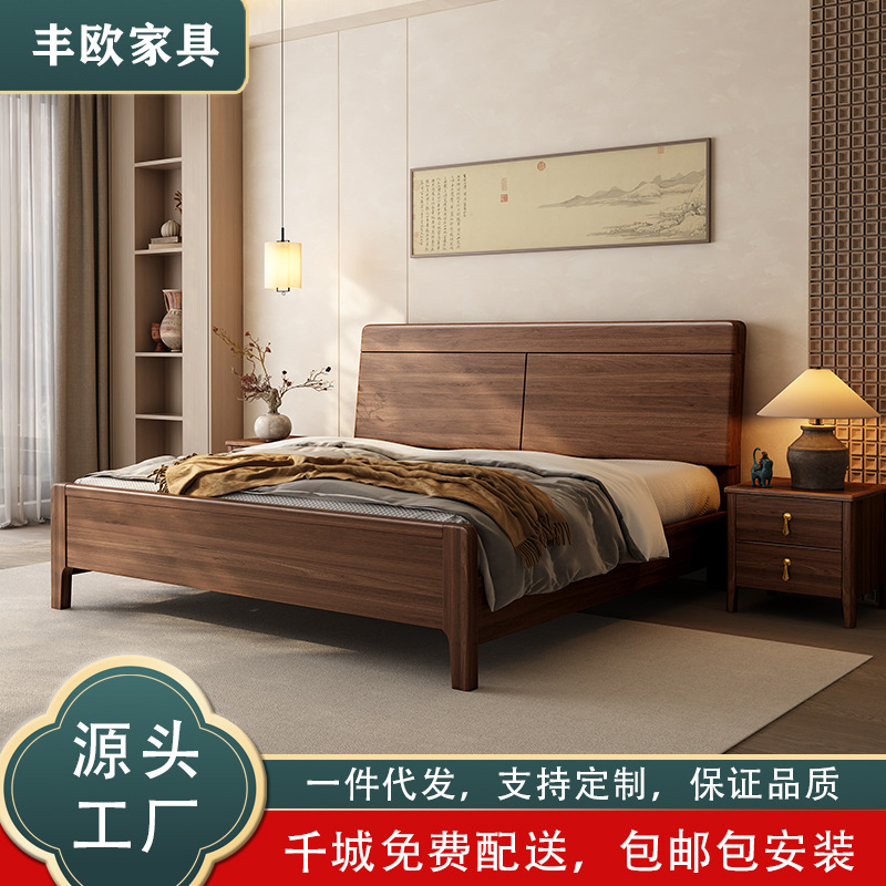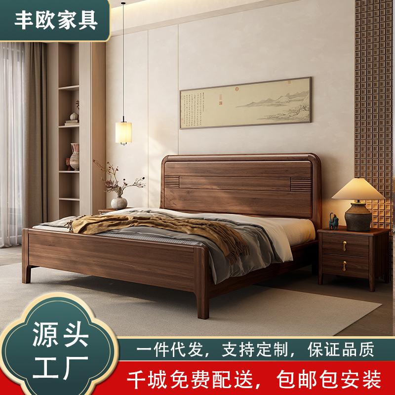 黒胡桃実木ベッド新中国式実木1.8メートルツインベッド主臥現代シンプル家庭用小戸型結婚ベッド