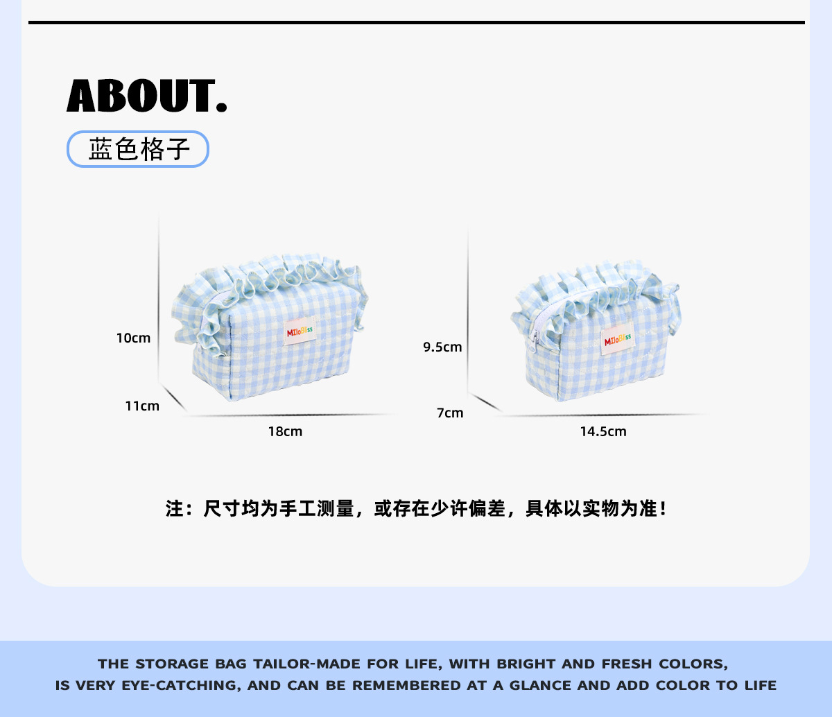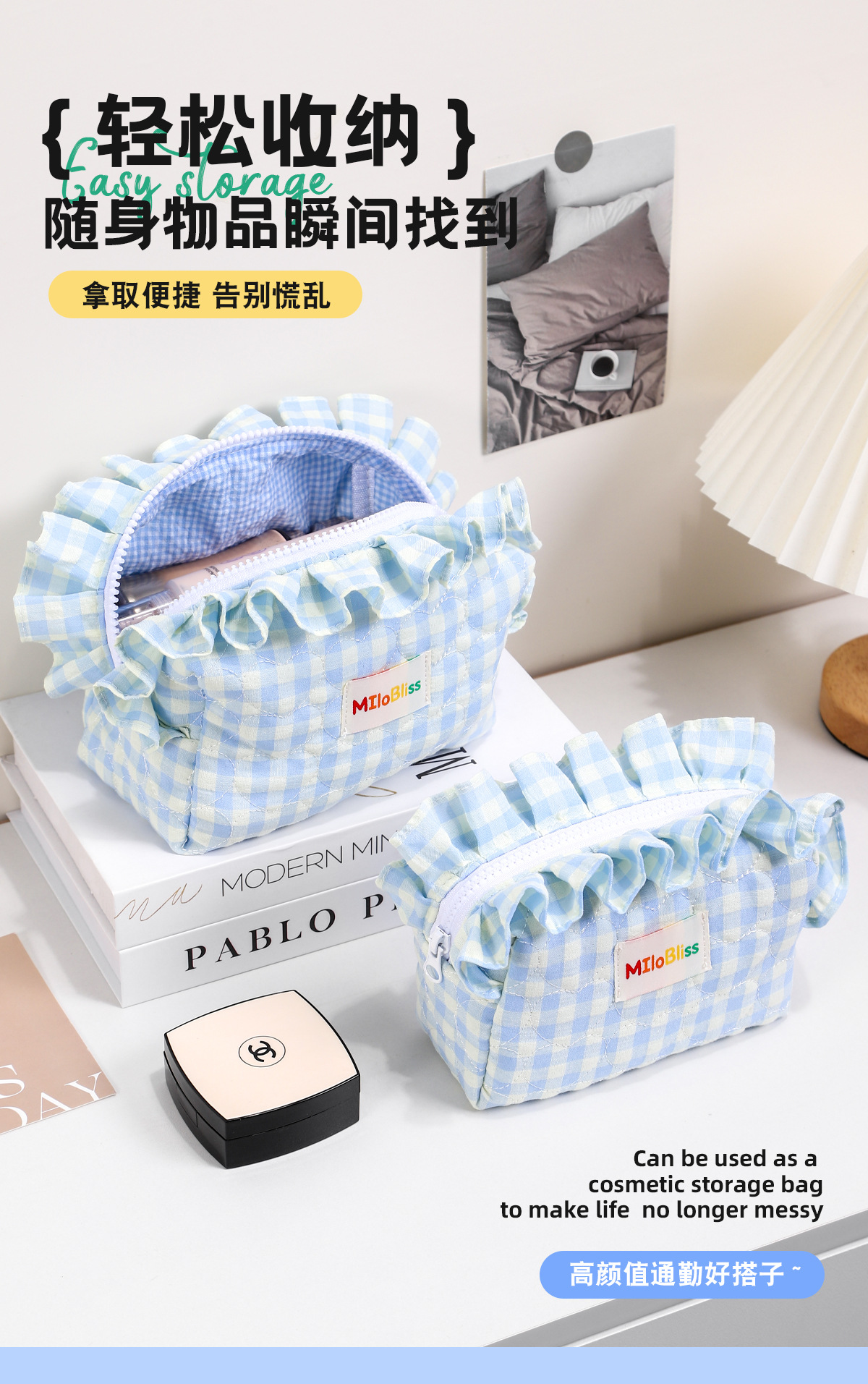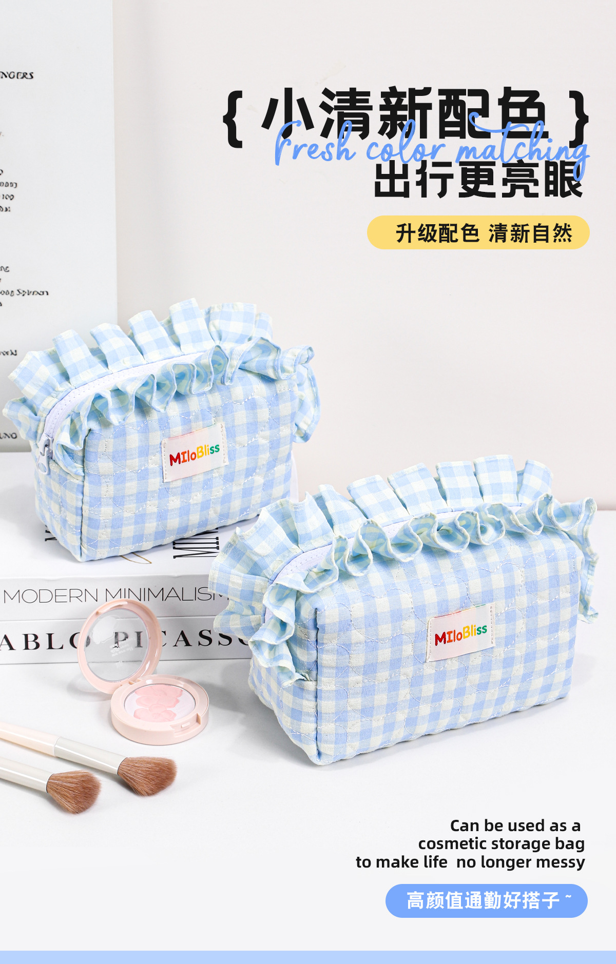 小清新荷叶边手提化妆包高颜值拼色格纹美妆包便携大容量收纳包
