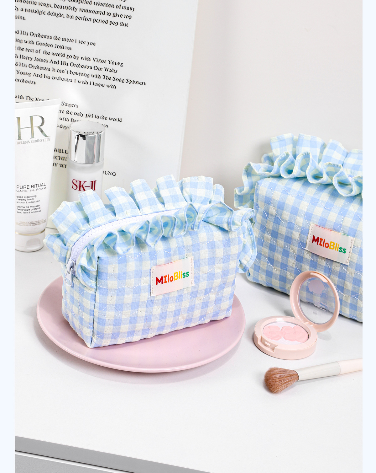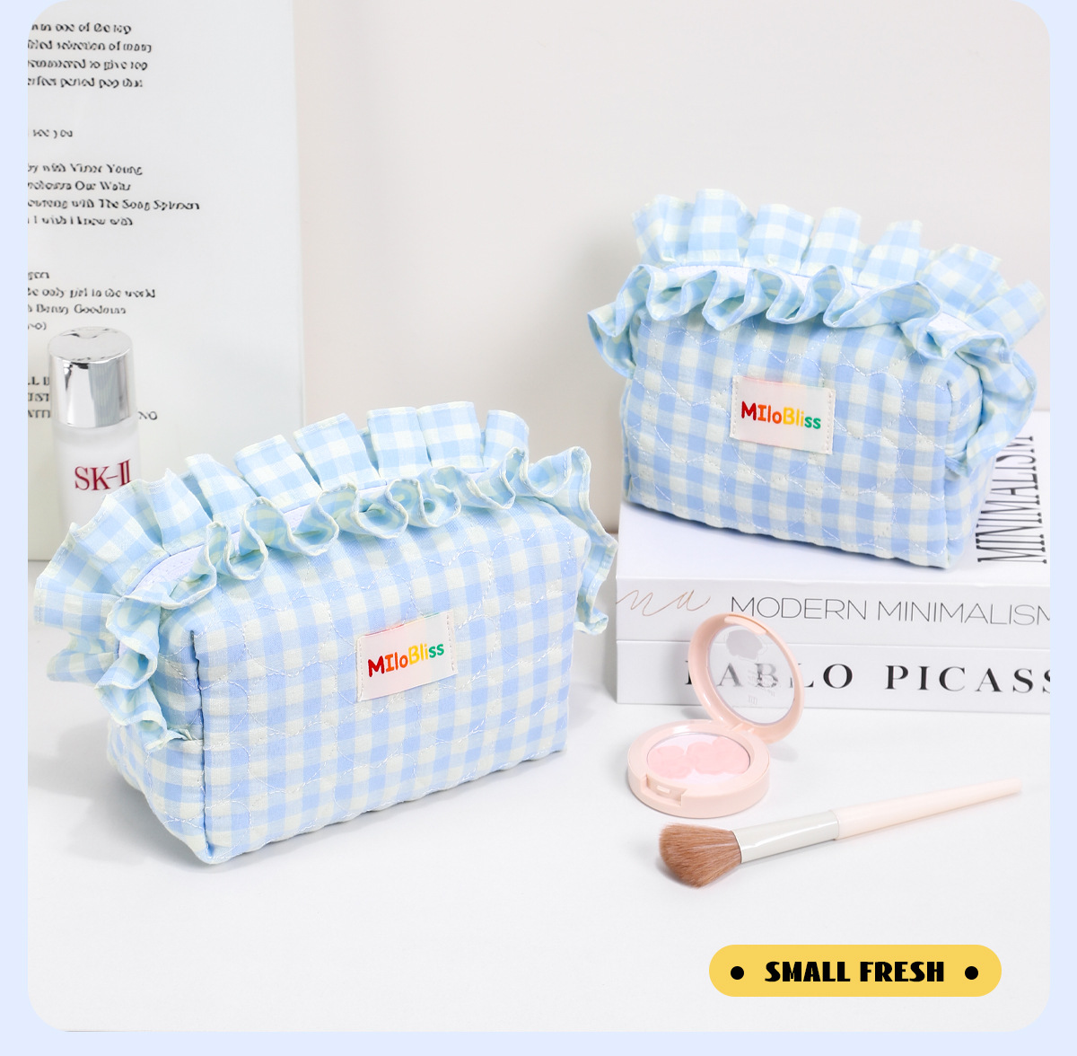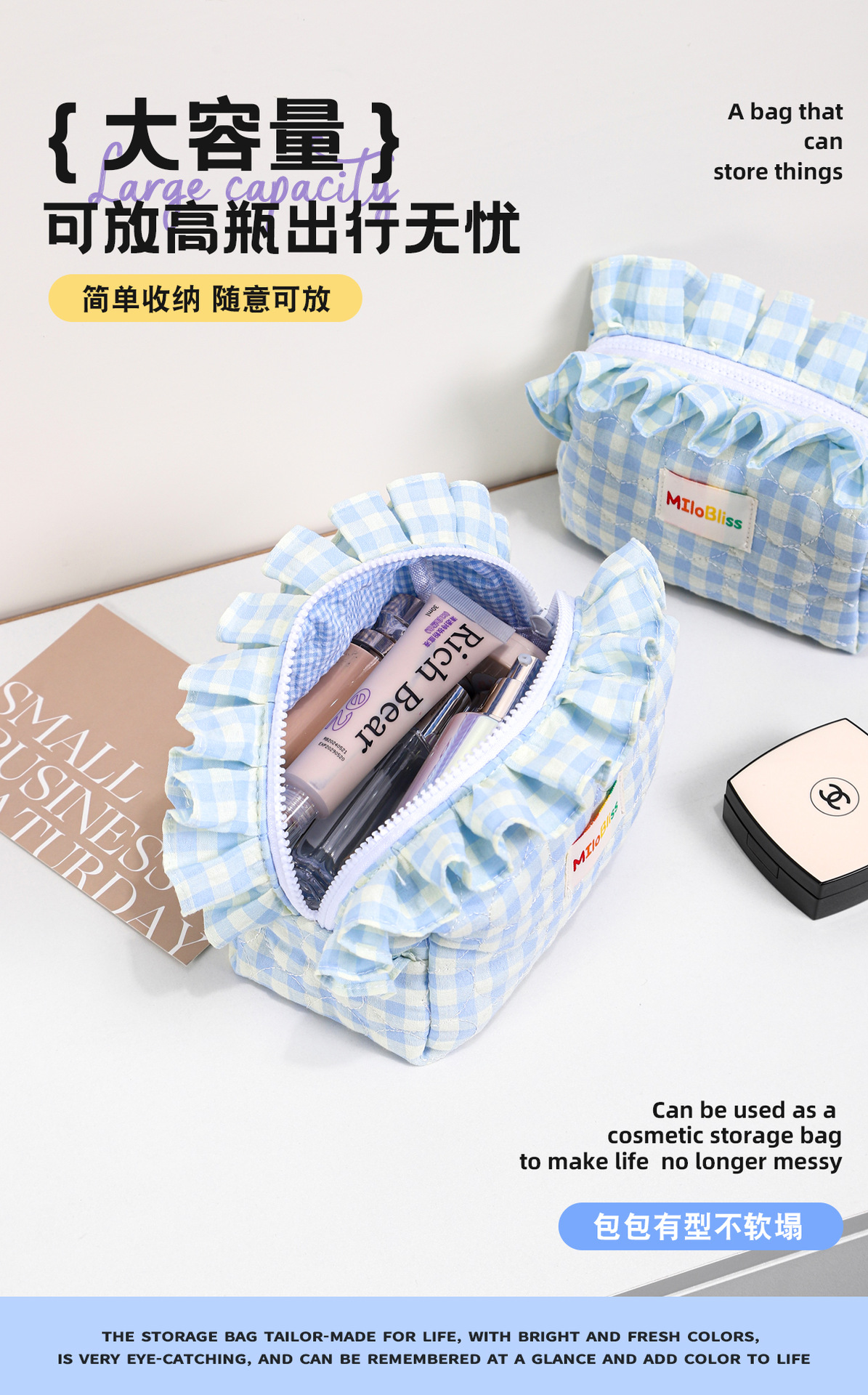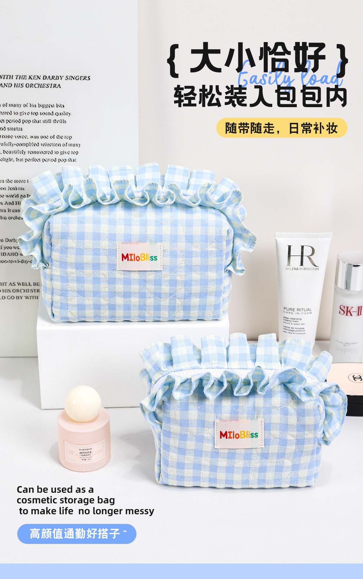 韓国の小さな新鮮なチェック柄の化粧品袋、大容量のレースの化粧品収納袋、見栄えの良い甘い化粧品袋