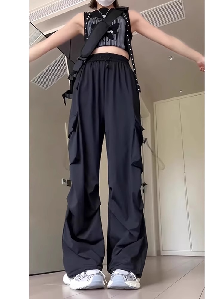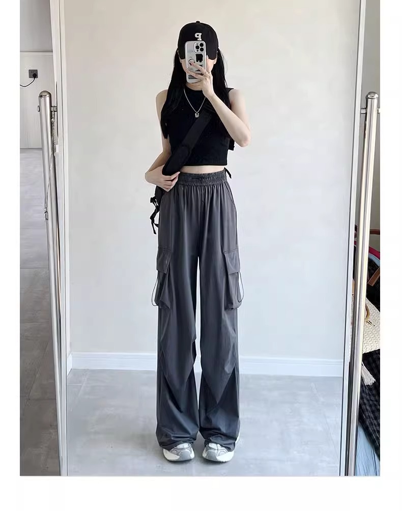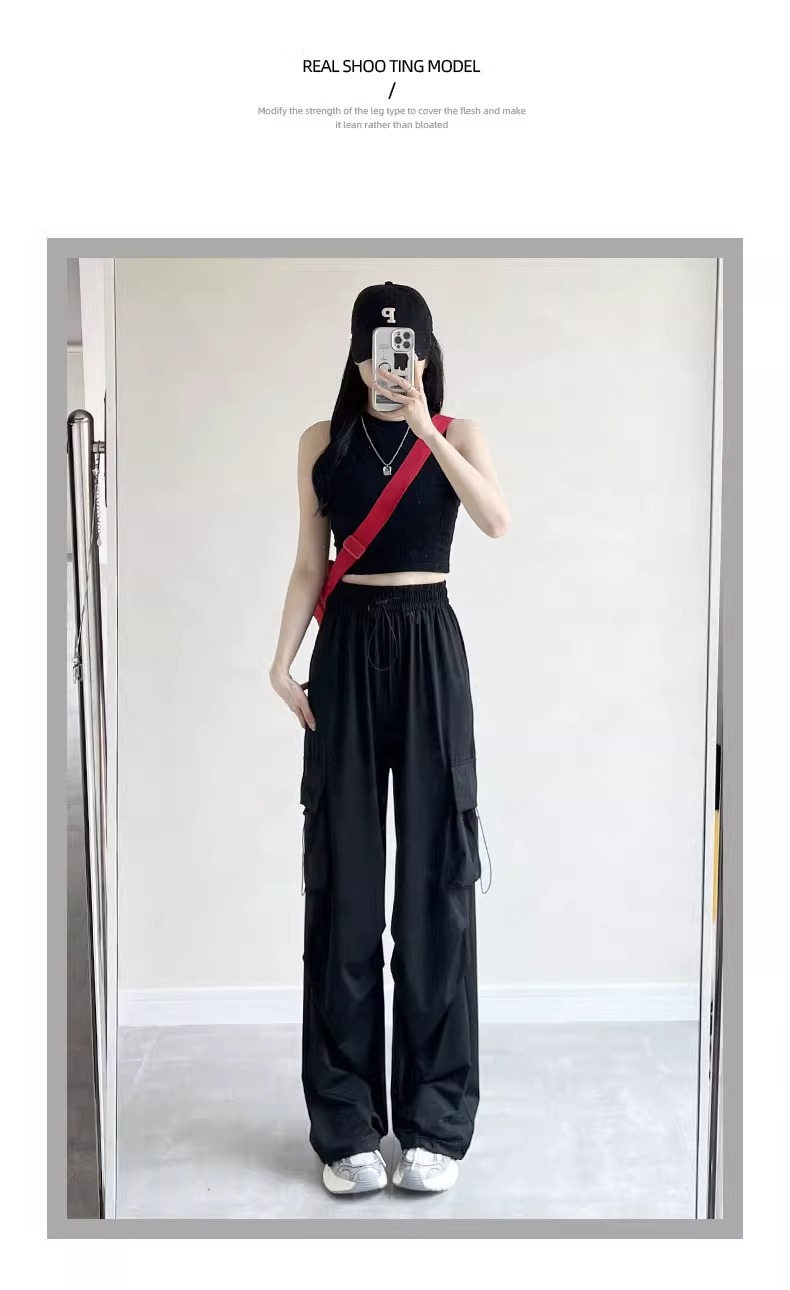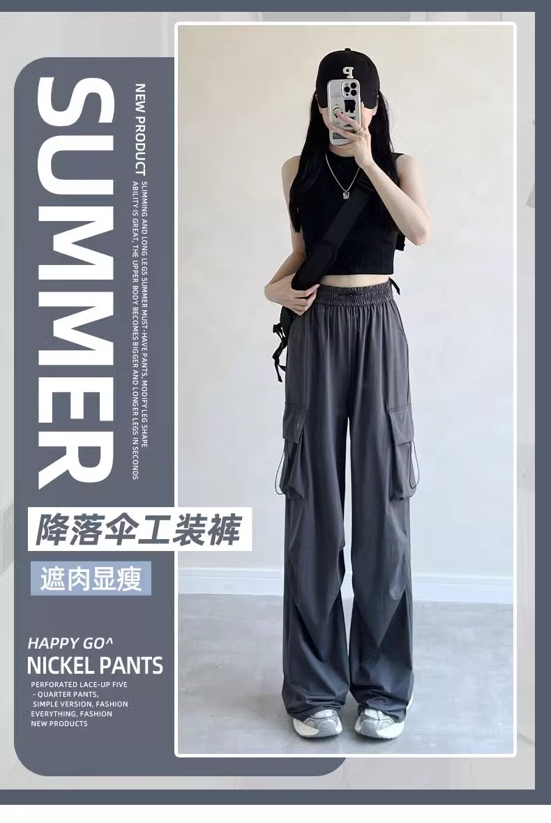 ナイロン工装ズボン女性夏薄手アメリカストレートパラシュートズボン高腰レジャー広脚速乾運動