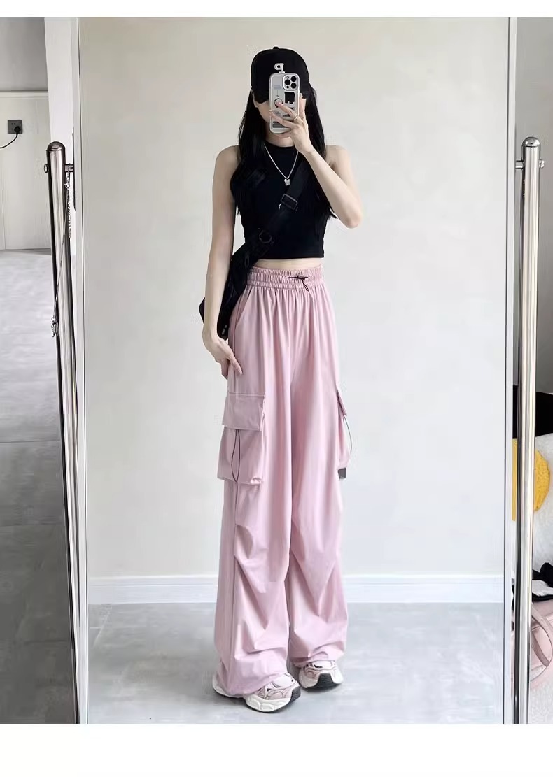 ピンクのオーバーオール女性のための春と夏 2025 新しいハイウエストカジュアルパラシュートワイドレッグパンツ小柄なアメリカンスポーツパンツ