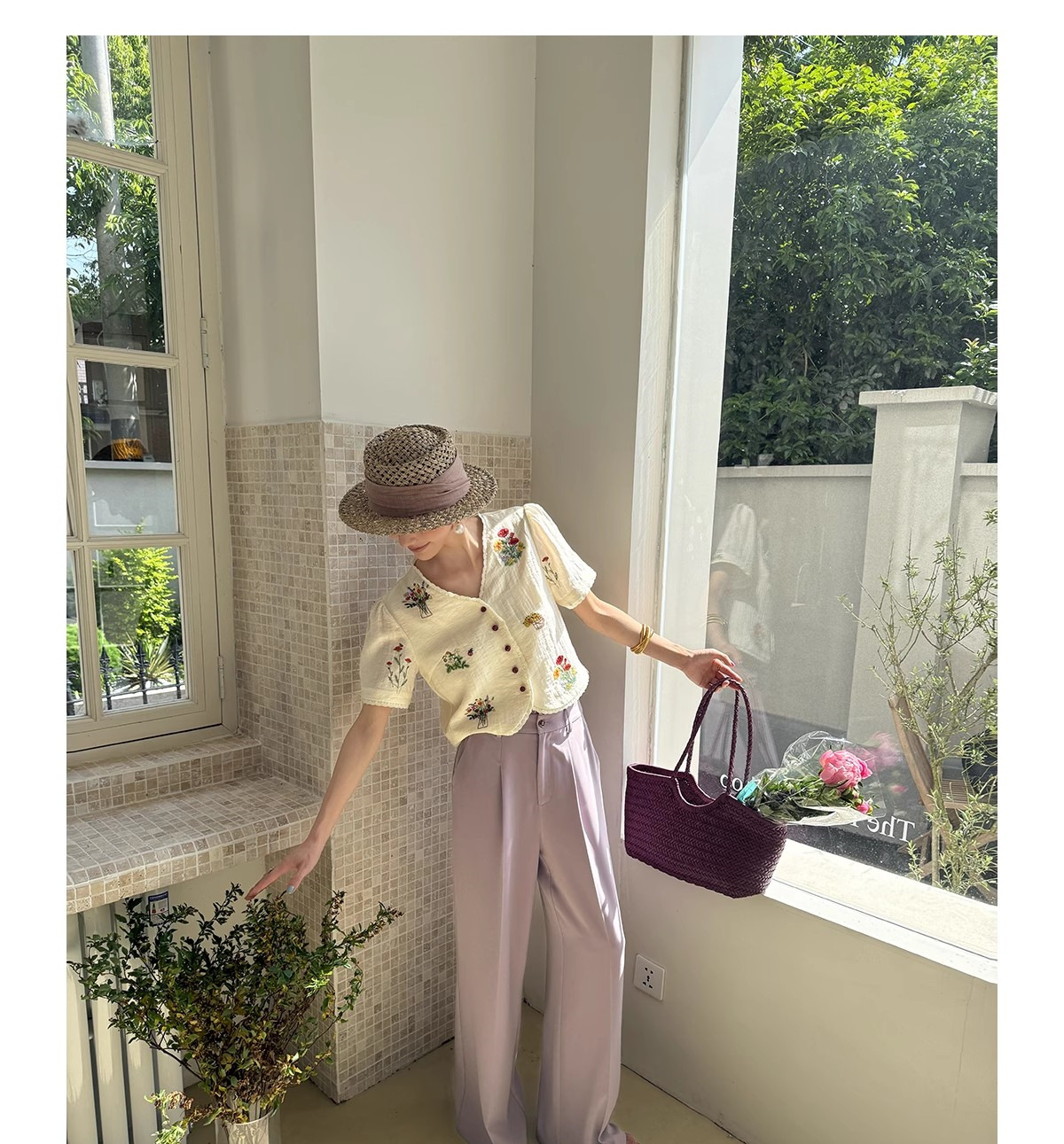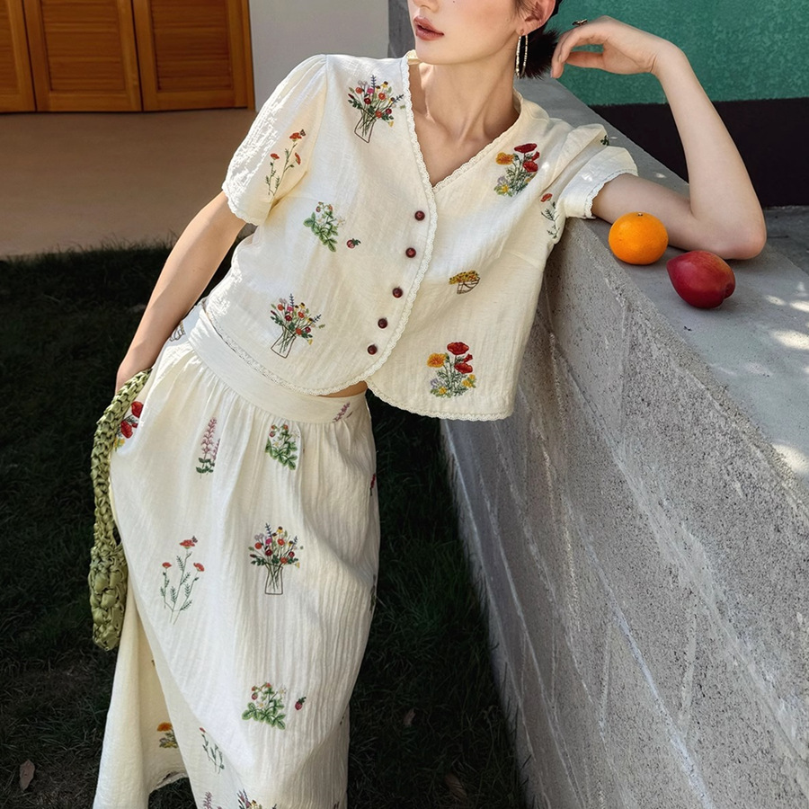 2025年新作夏スタイル【Everything You】リネンヘビーウェイト刺繍デザイントップスとスカートスーツの女性用複数バージョン