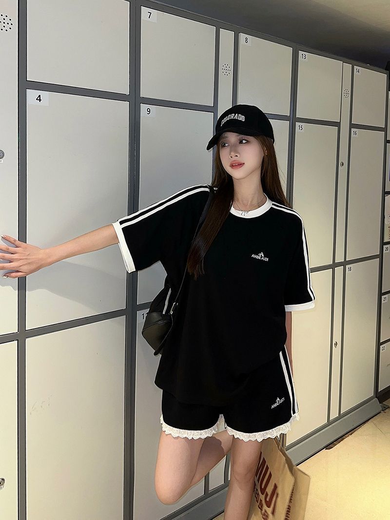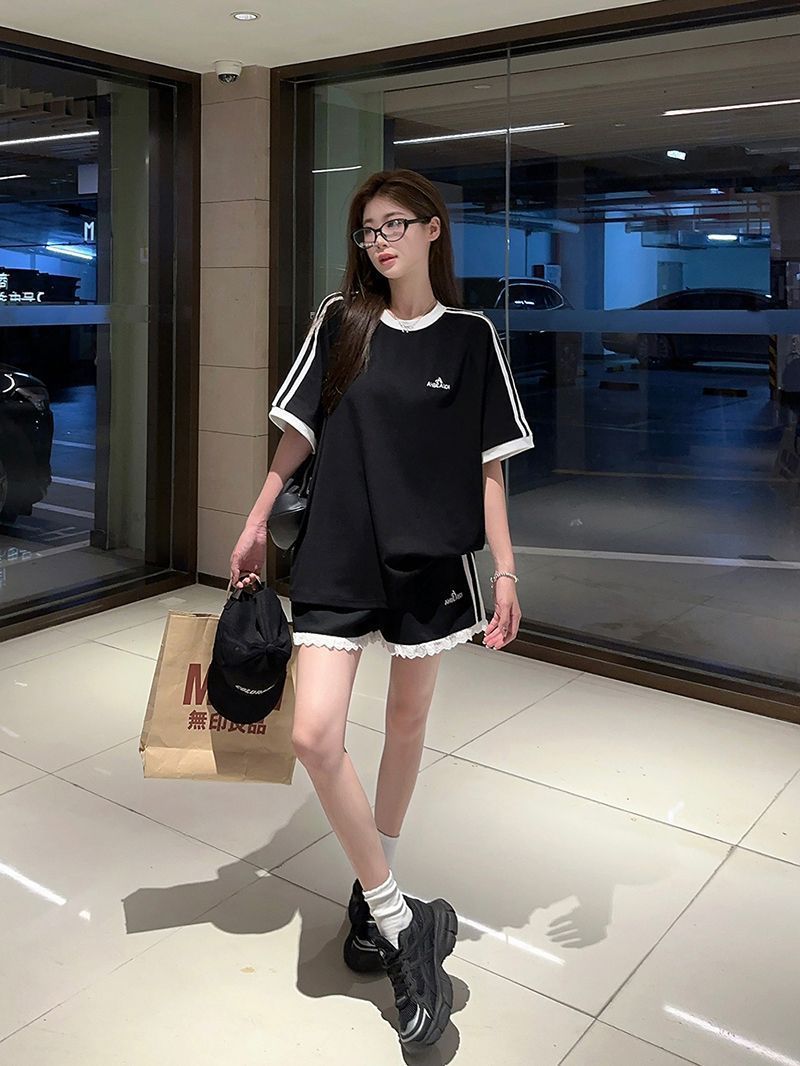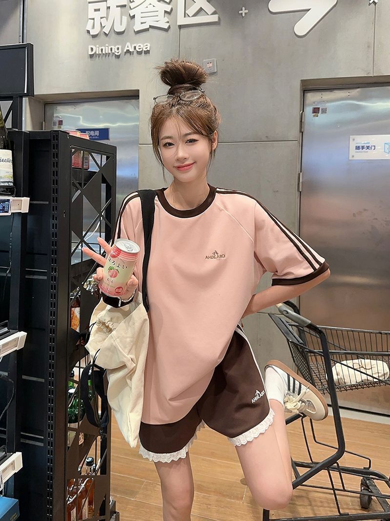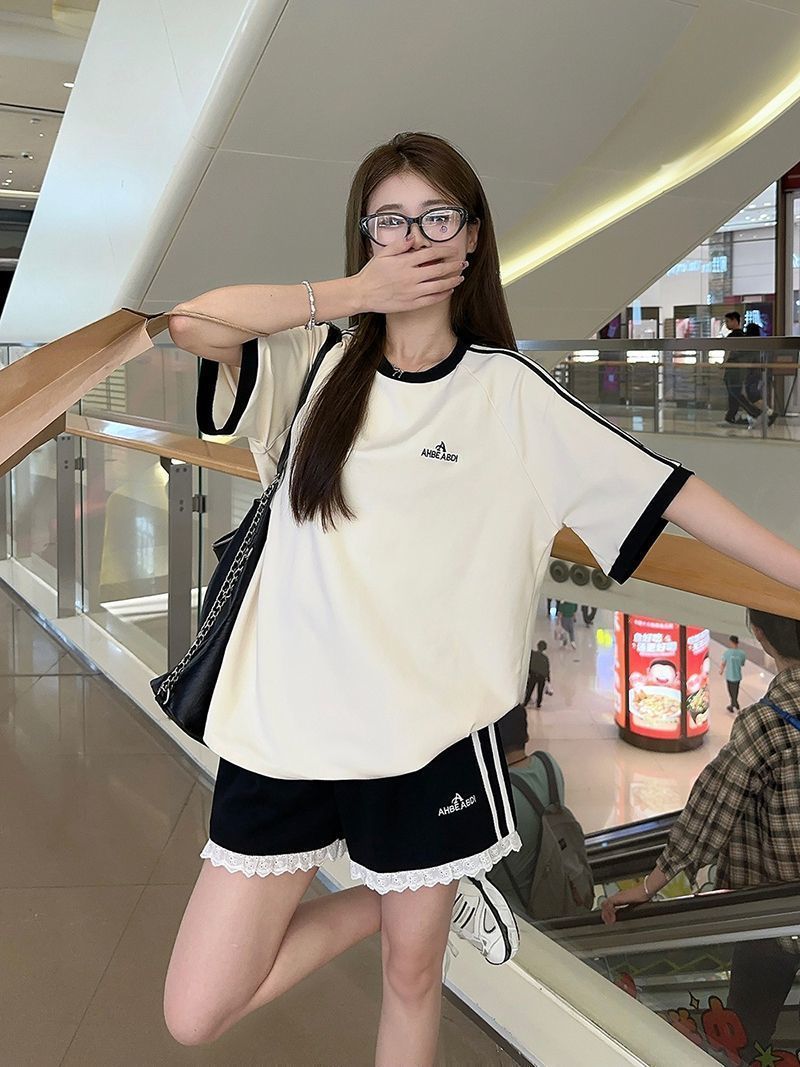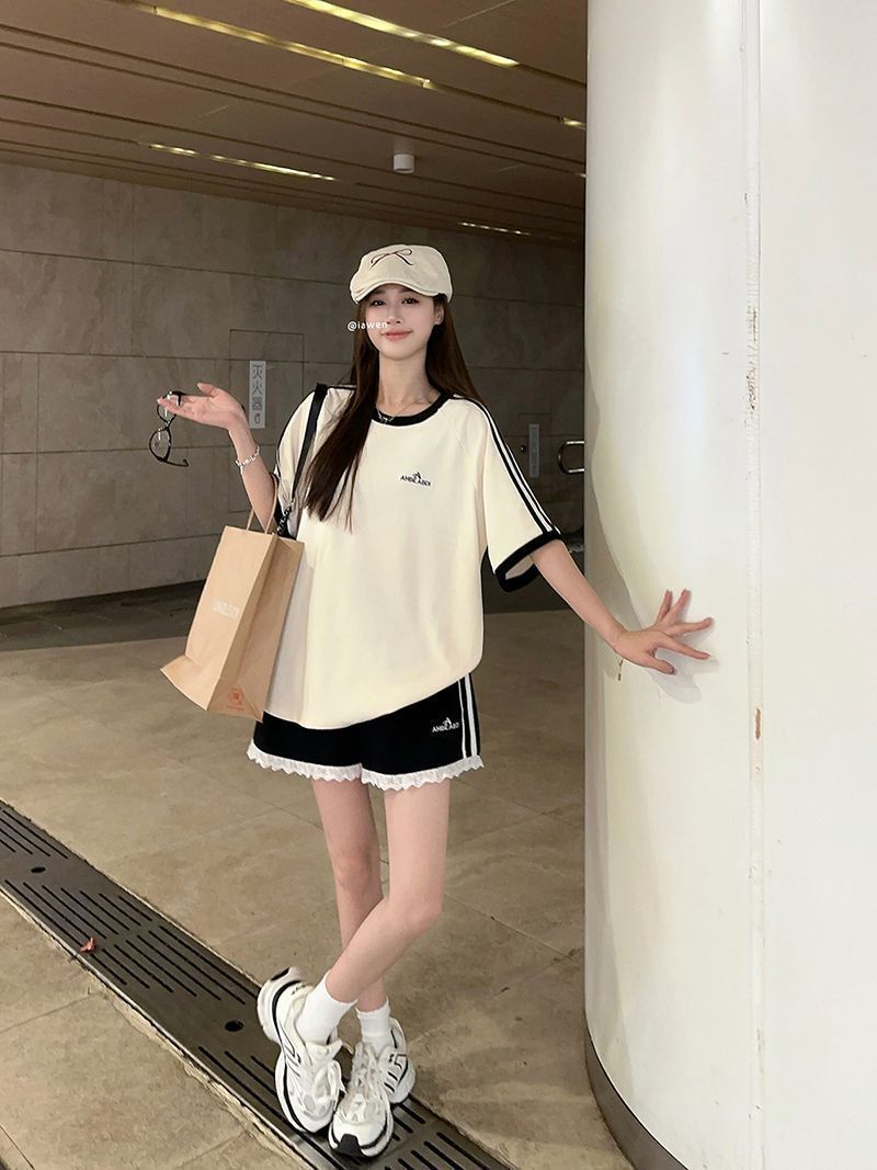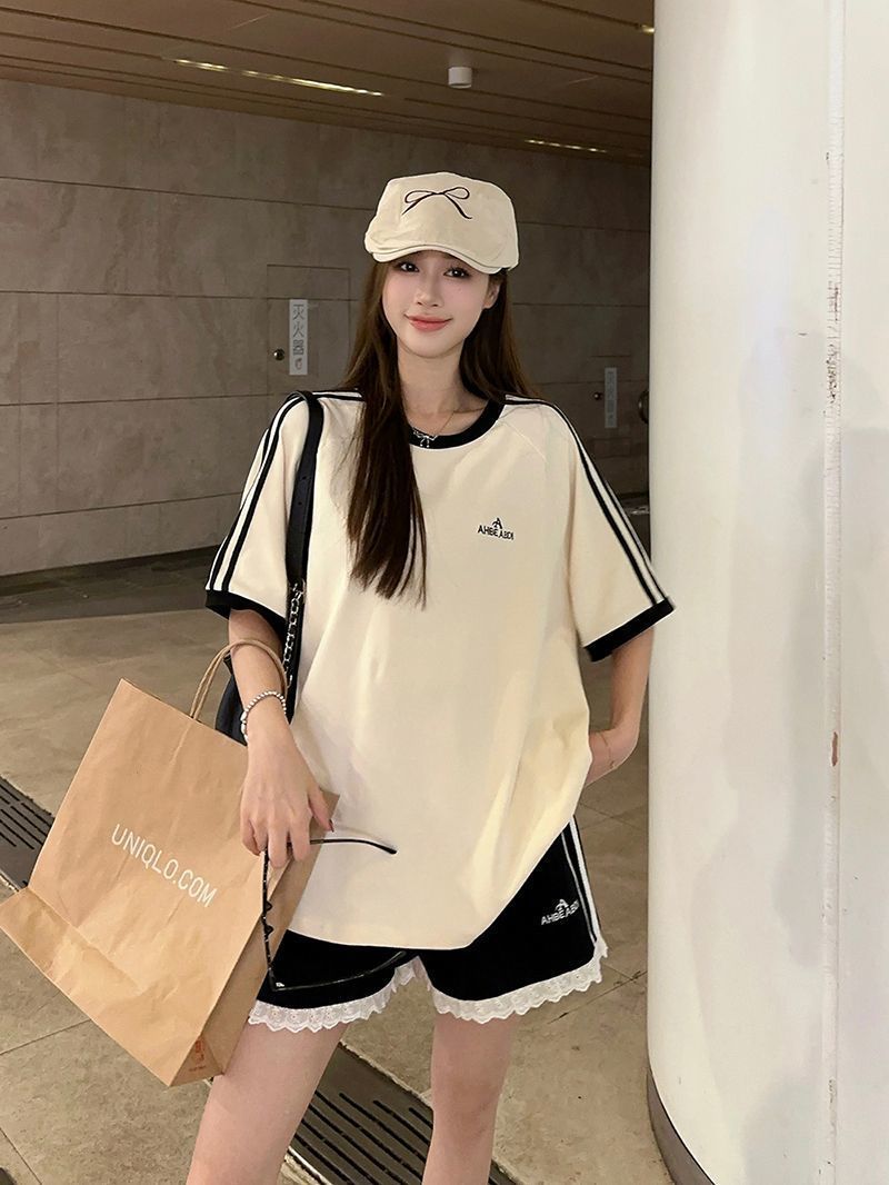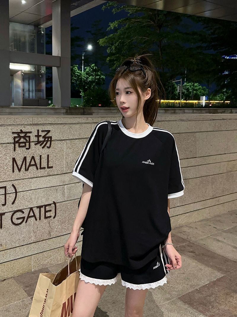 ファッション服レディーススーツコントラストカラールーズスリム半袖Tシャツ夏のレースワイドレッグショーツカジュアルスポーツウェア