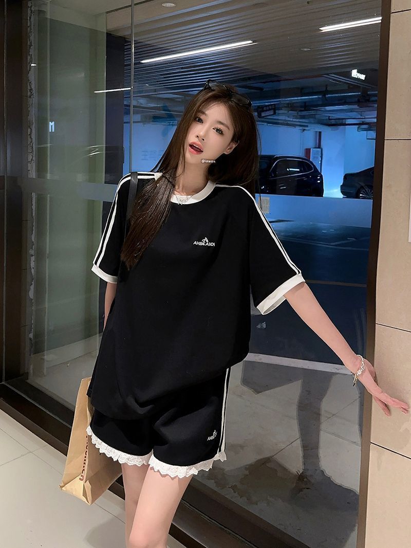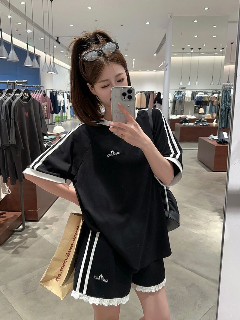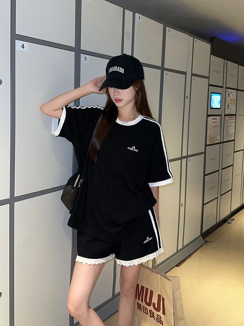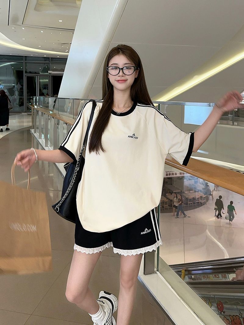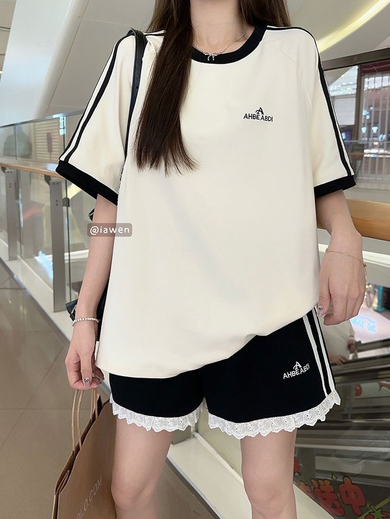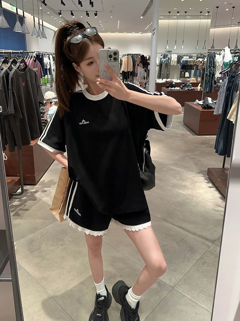ファッション服レディーススーツコントラストカラールーズスリム半袖Tシャツ夏のレースワイドレッグショーツカジュアルスポーツウェア