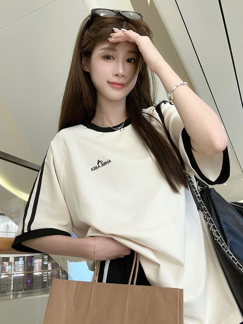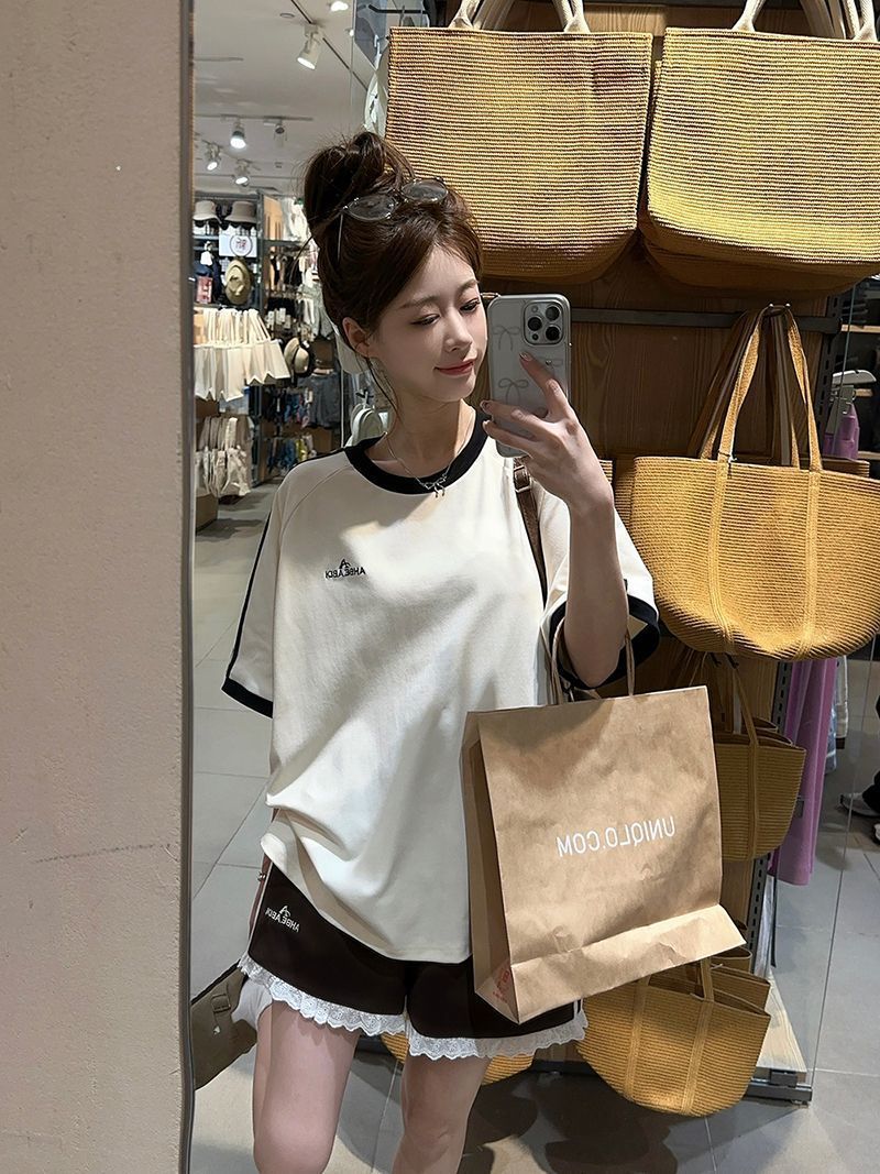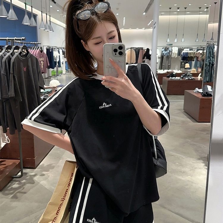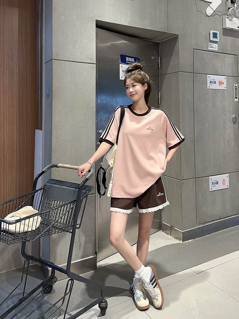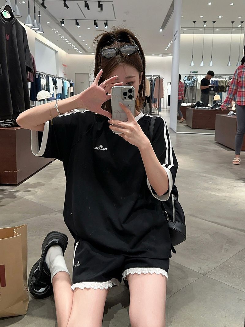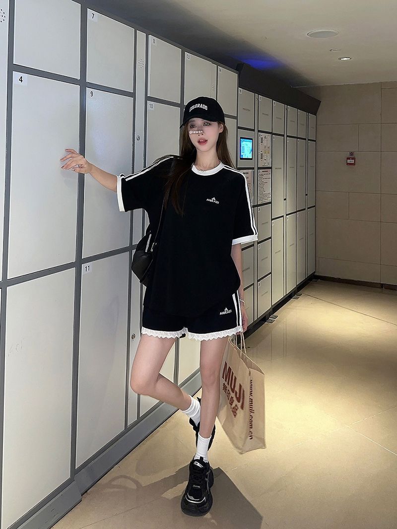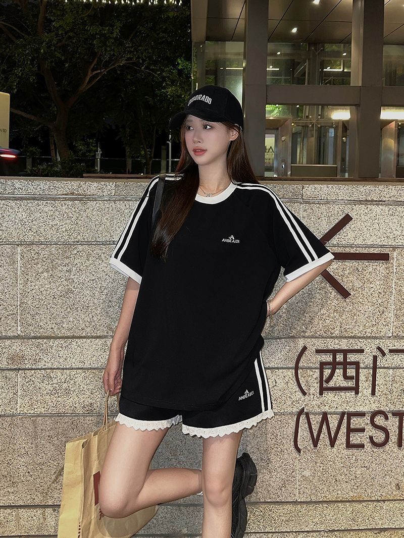 ファッション服レディーススーツコントラストカラールーズスリム半袖Tシャツ夏のレースワイドレッグショーツカジュアルスポーツウェア