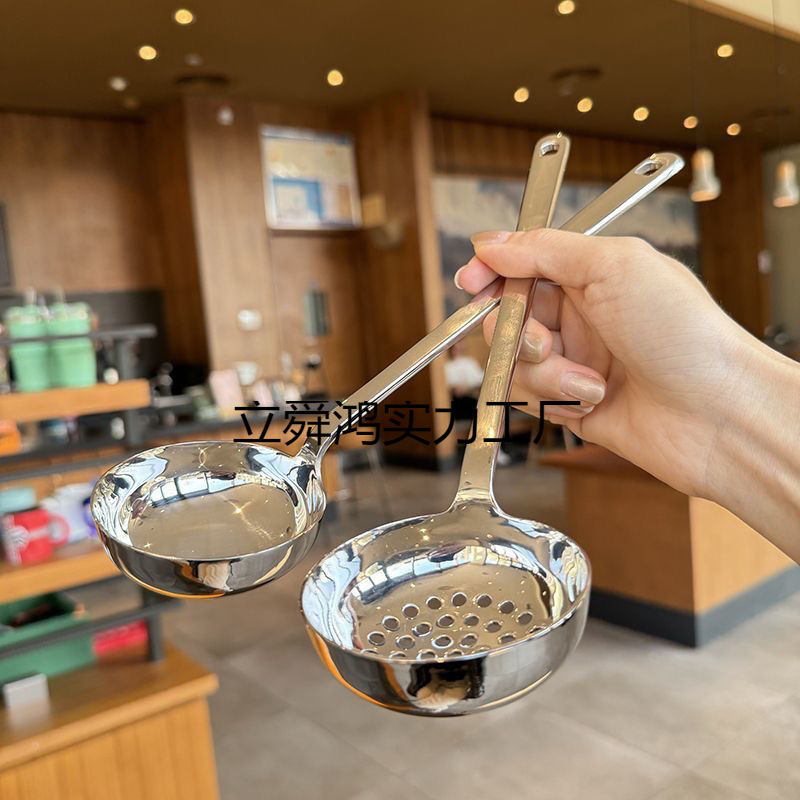 平底の新しいステンレス製スープスプーン、見栄えの良い家庭用長柄鍋スプーン、深めのスープスプーン、ネット有名人のザル