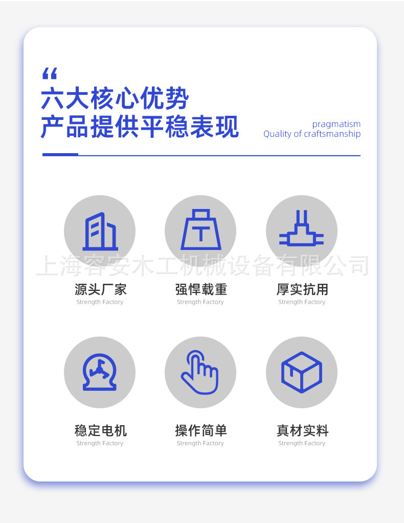 上海容安木工机械设备有限公司在生产销售自有品牌的家具机械的同时,可为客户提供板式家具、实木家具、实木地板、复合地板、门窗、指接板、细木工板、多层胶合板等整厂生产线成套设备。