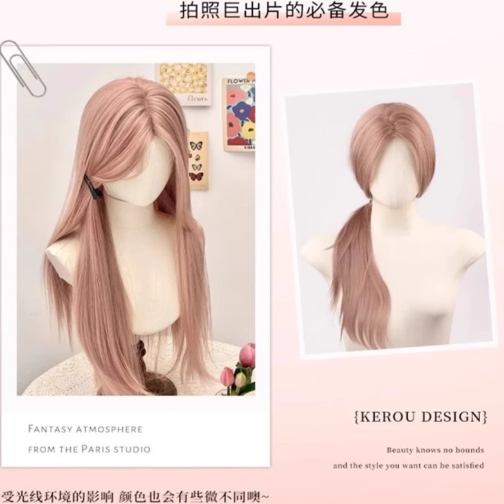 【ピンクローズ】女性用ウィッグ フルヘッドセット 雰囲気 ピンク シームレス ミディアム ストレートヘア 薄くて見えない デイリーウィッグ