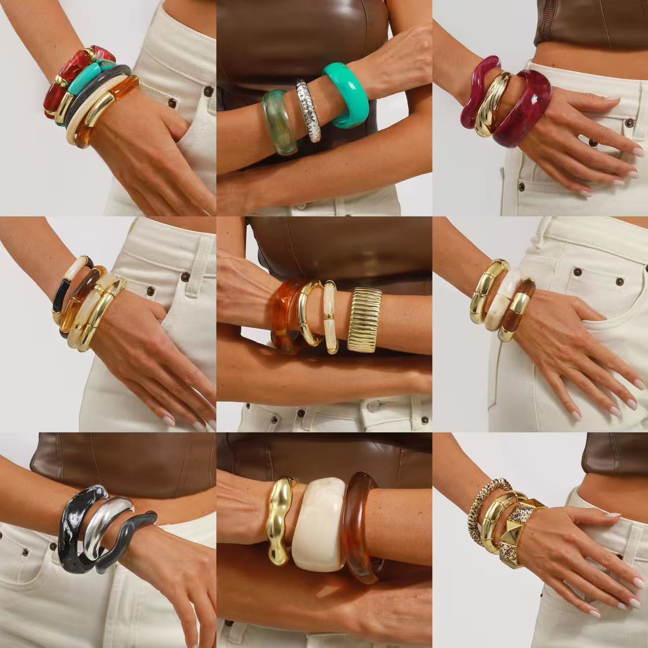 跨境个性几何不规则亚克力合金宽手镯复古夸张美拉德多色百搭手环