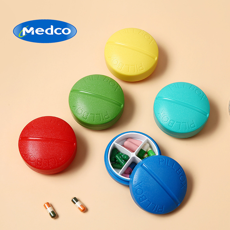 跨境专供圆形4格迷你药盒便携式四格药盒随身一周旅行药丸收纳盒