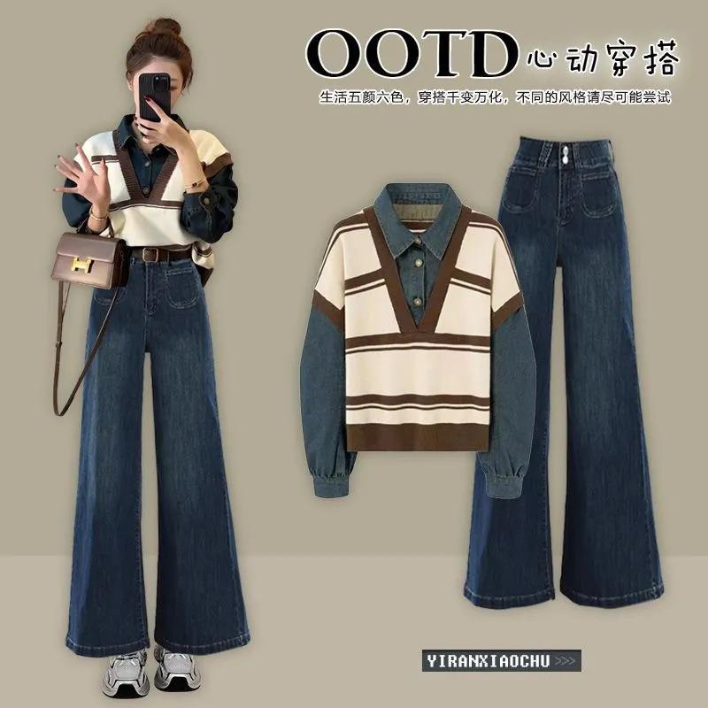 韓国版は2024秋のセットの女性を着て、ストライプのデニムの偽の2つのニットのカジュアルなズボンの2つのセットをつなぎます。