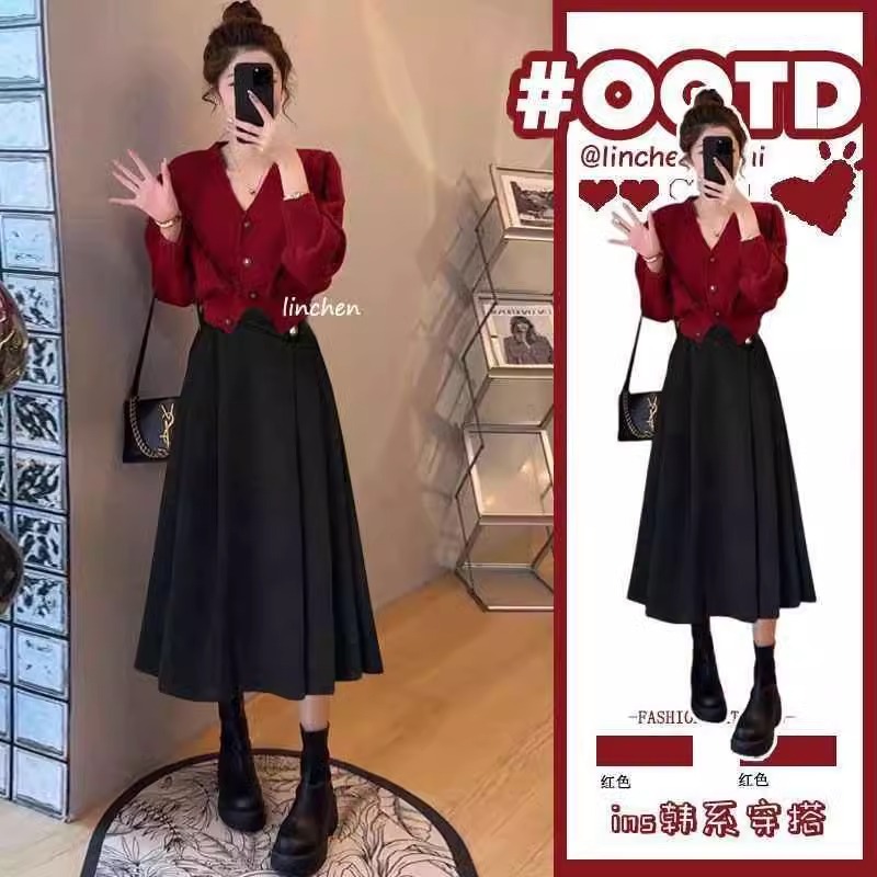 春秋高级感减龄穿搭女新款小众红色新中式针织毛衣半身裙两件套装