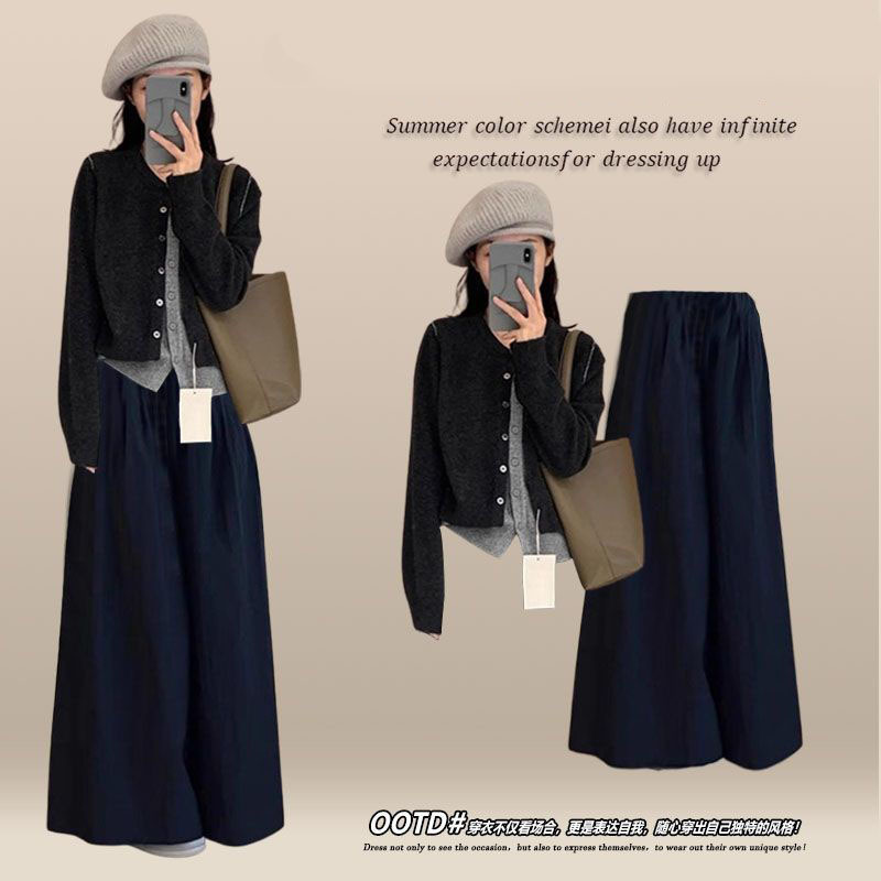 巨好看的早秋一整套装女韩系温柔风通勤休闲灰色开衫阔腿裤两件套