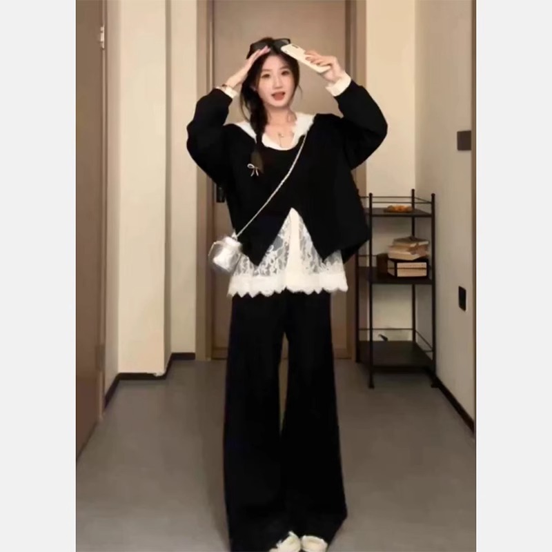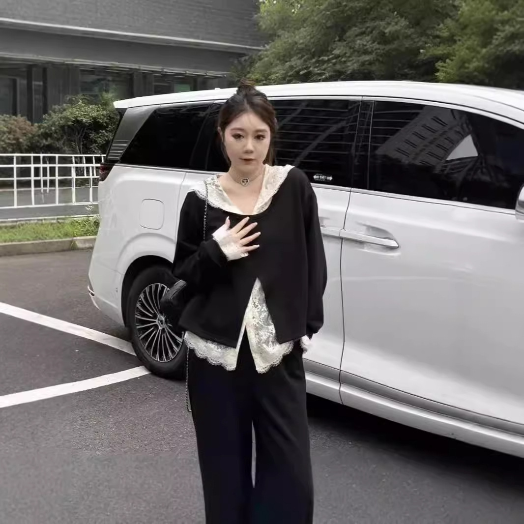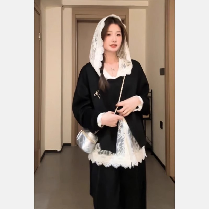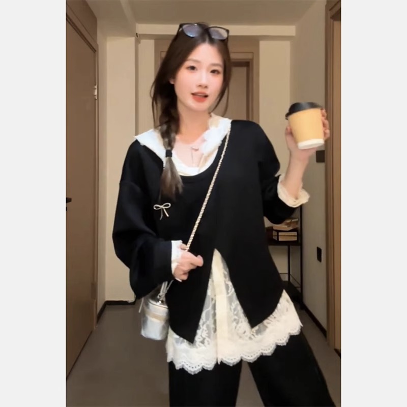 入春小众别致独特穿搭女蕾丝拼接假两件连帽上衣阔腿裤两件套装潮